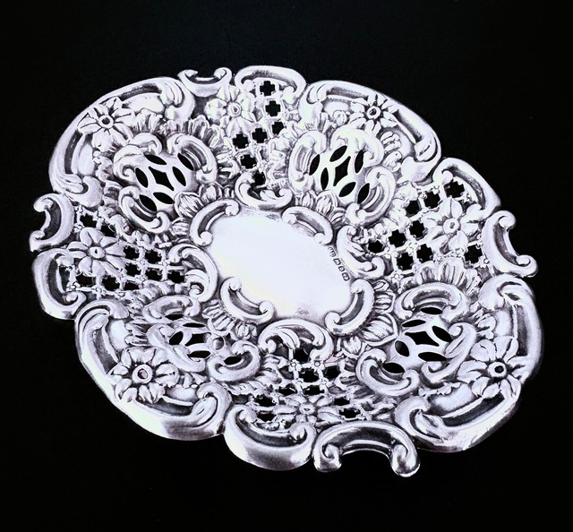 英国アンティーク トレイ/ピン ディッシュ 透かし文様 小皿 スタンド付 シルバー純銀31g ビクトリア期 1895年GU社製GEORGE UNITE シルバーウエア テーブルウエア 英国雑貨 アンティークのある暮らし
