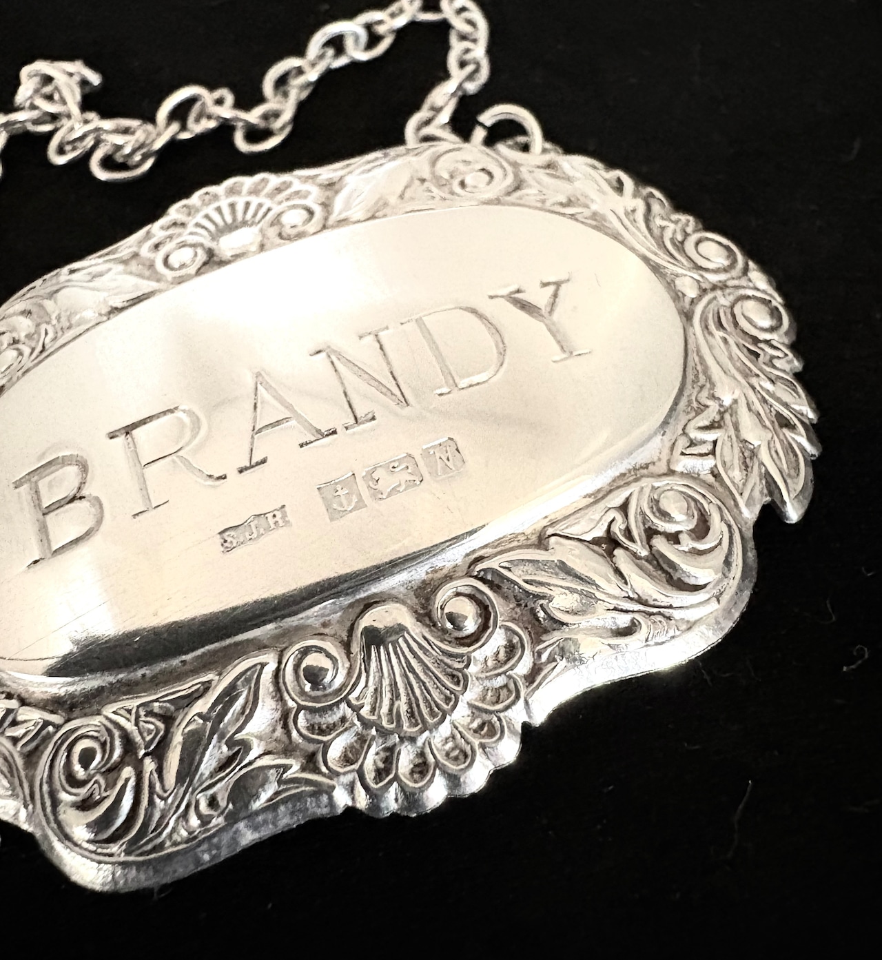 英国ビンテージ BRANDY/ブランデー シルバーラベル デカンタ BAR用品 ボトルアクセサリー 純銀12.2g バーミンガム 1973年 S.J. Rose & Son社製 オールドビンテージ コレクション 英国雑貨 Britishmade