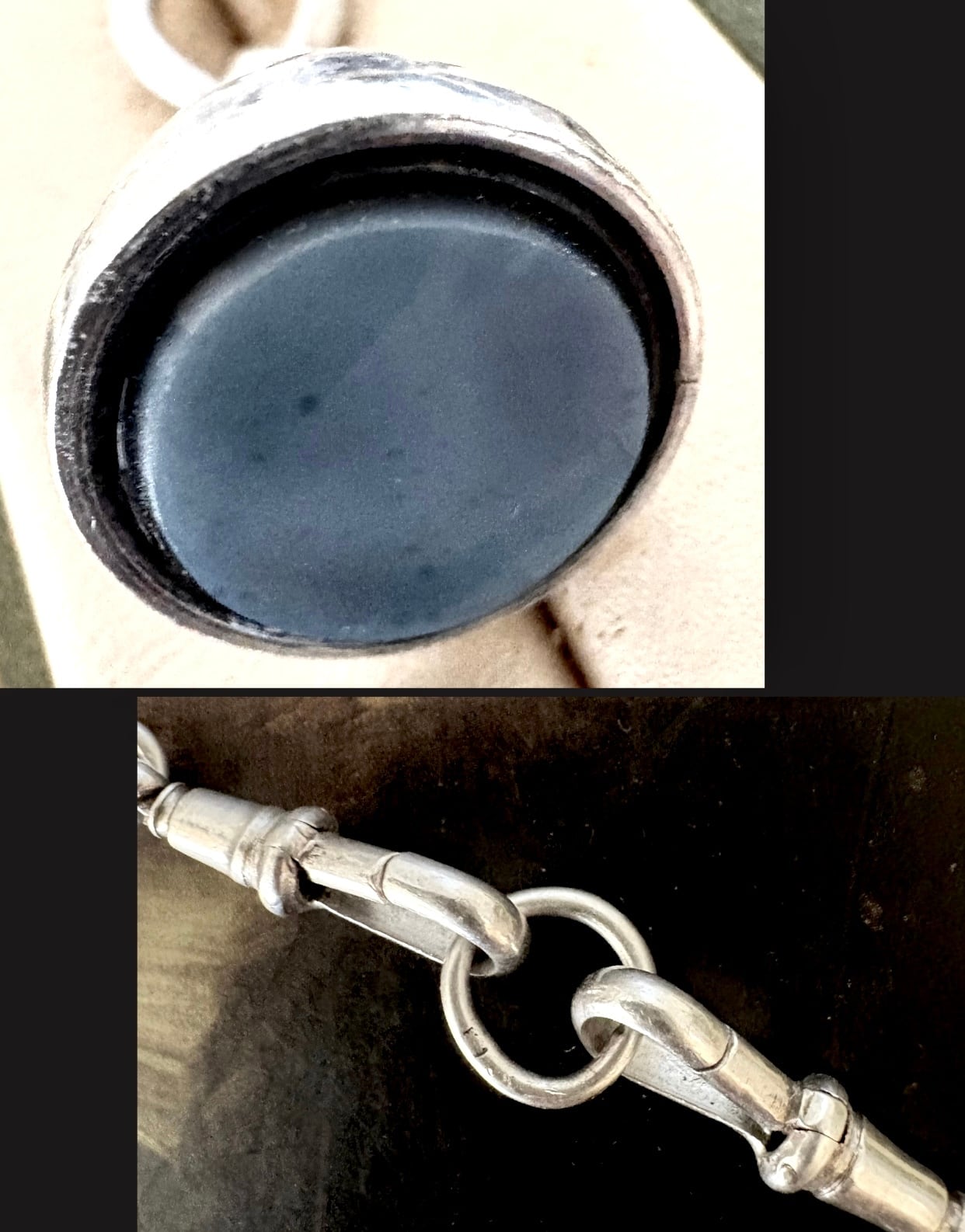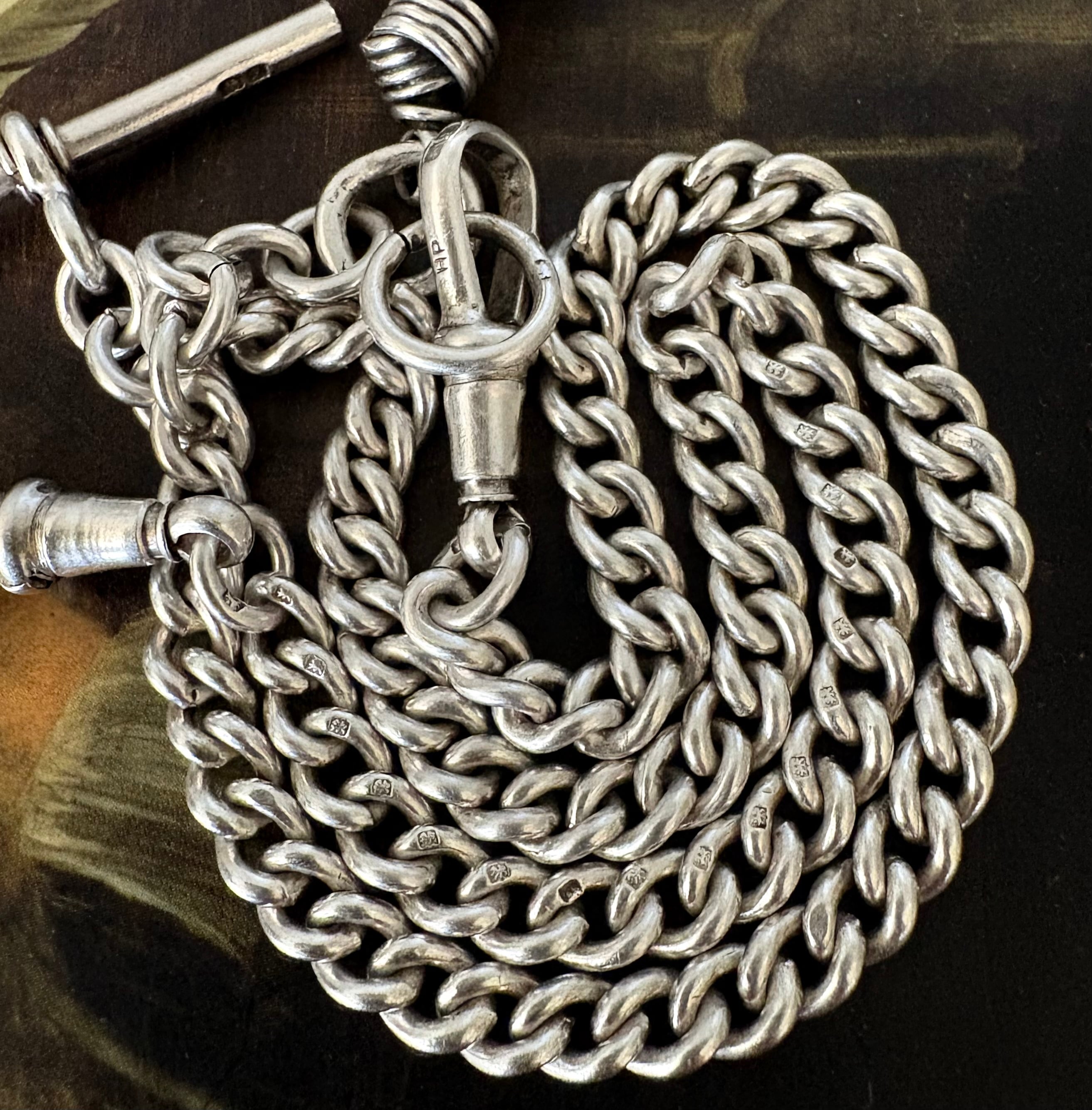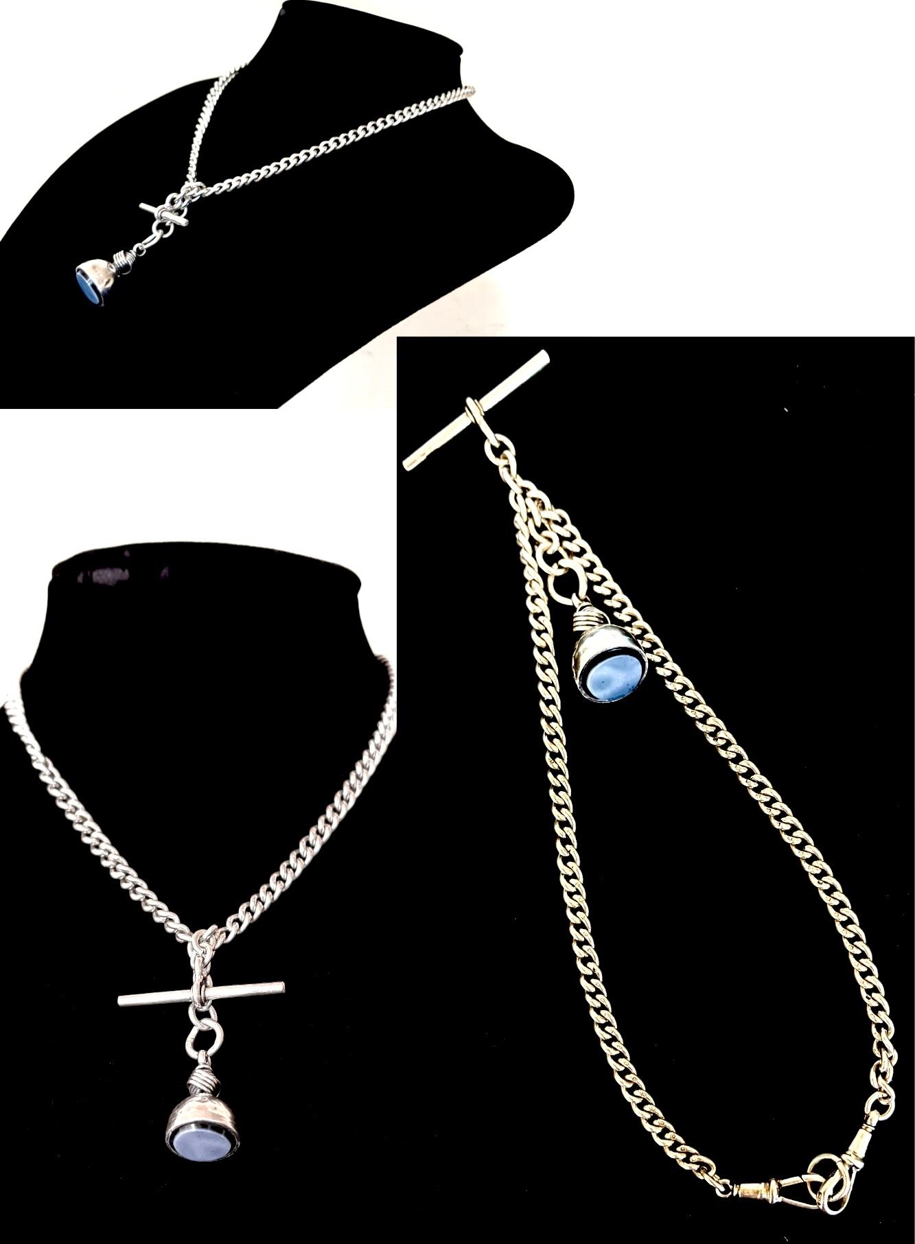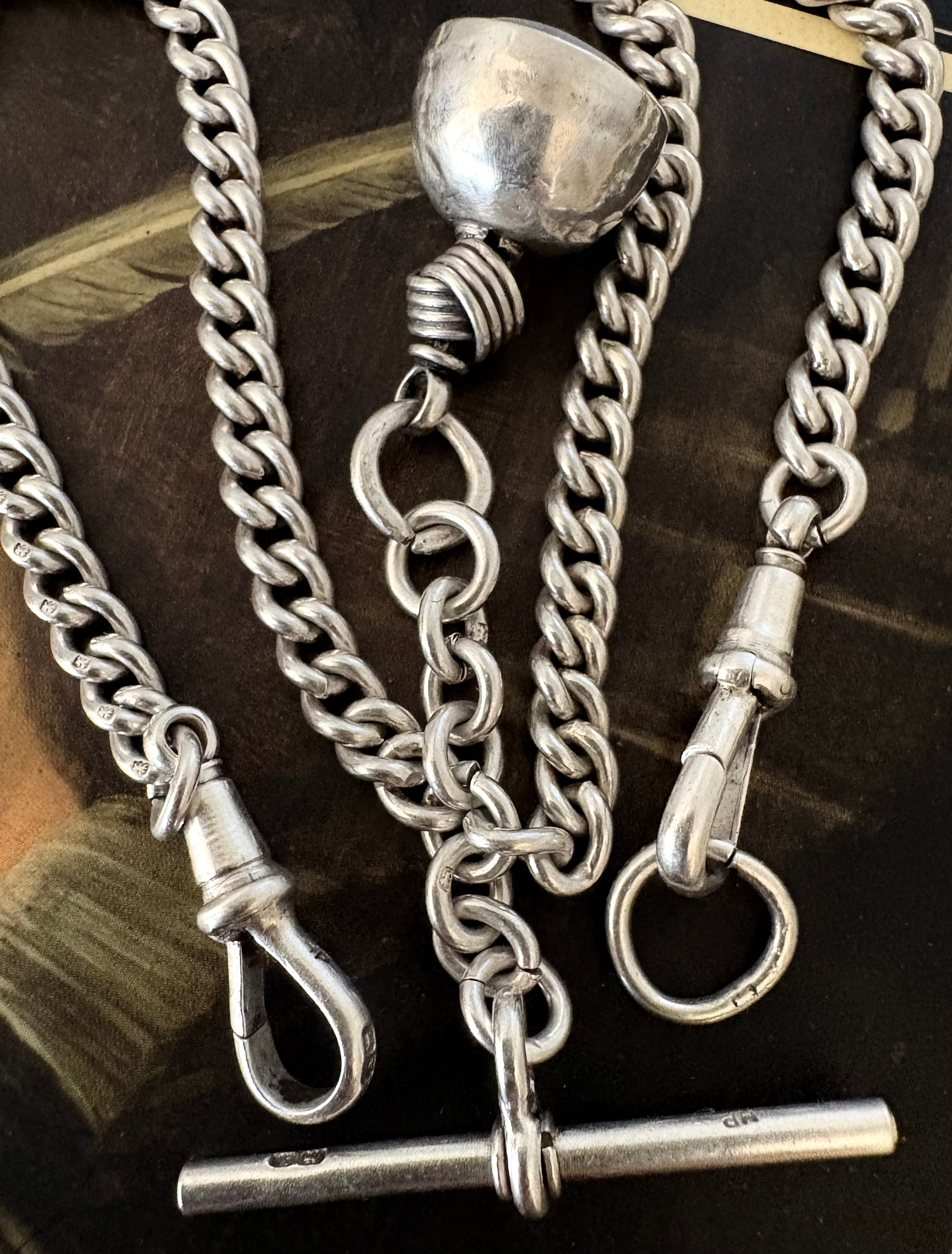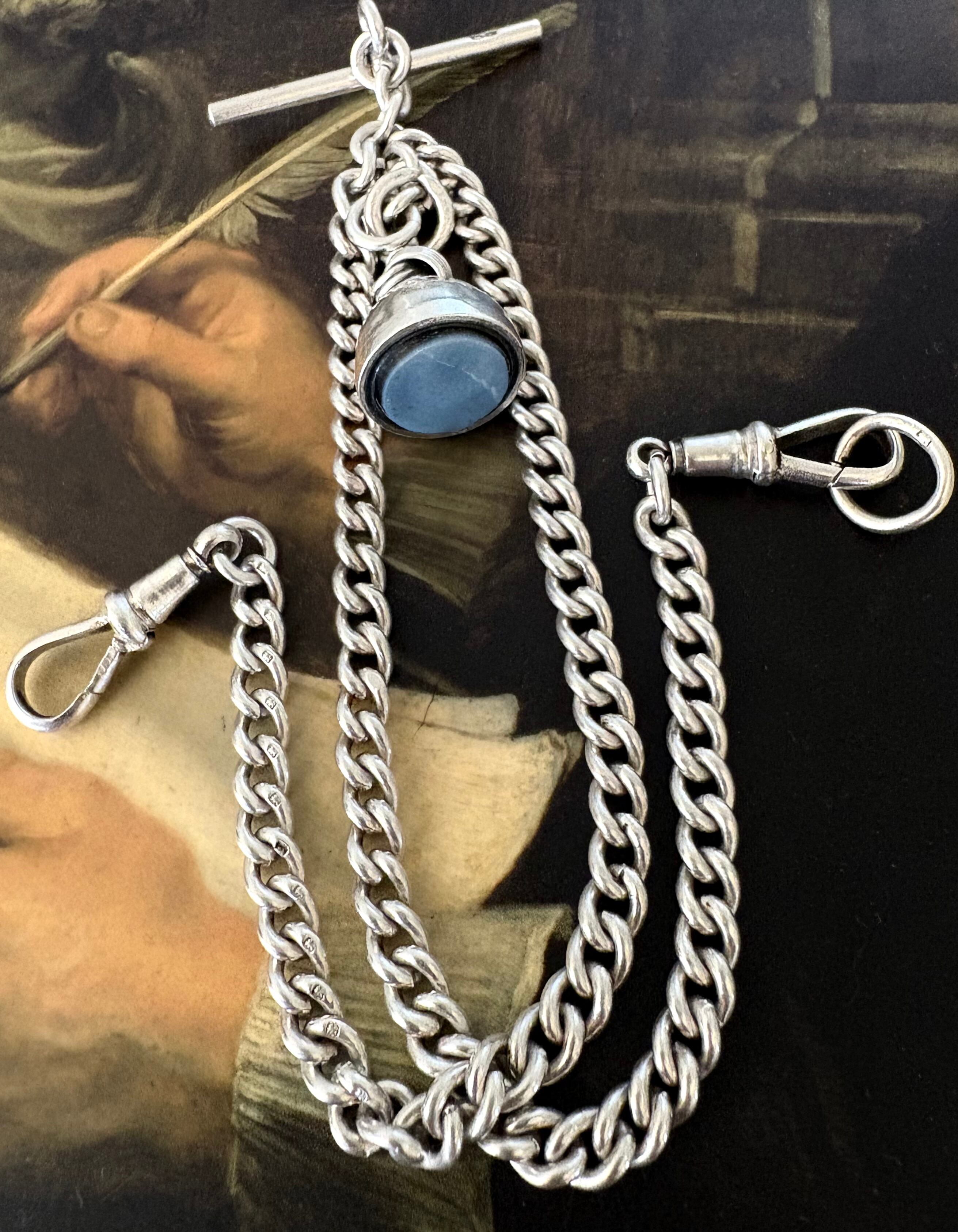 英国アンティーク ダブルアルバートチェーン ドーム型 紫陽花色 アーゲート石付 シールフォブ 封蝋 銀繊細工 バーミンガム 1923年 シルバー純銀37.7g 懐中時計/ペンダントネックレス Henry Pope アンティークジュエリー