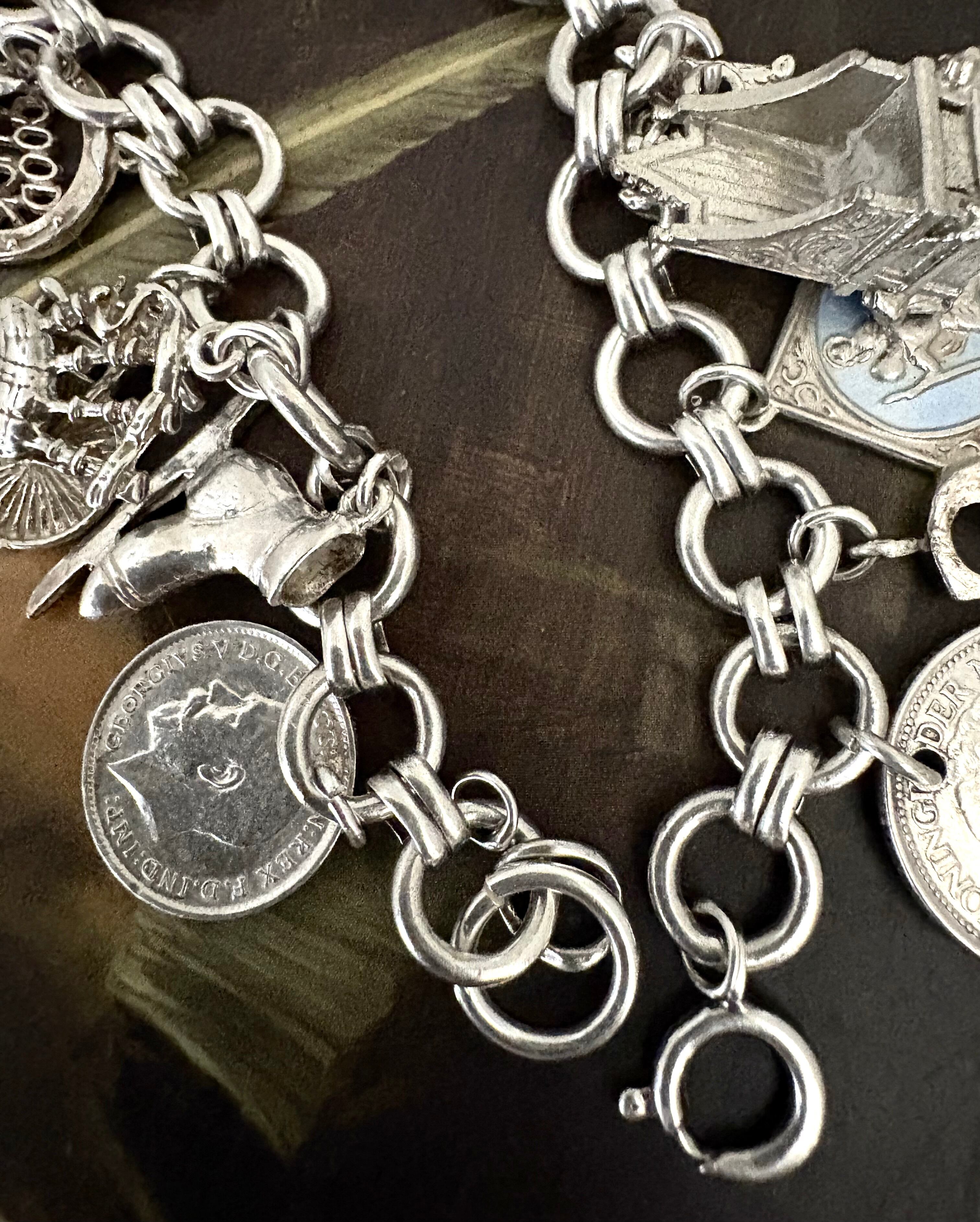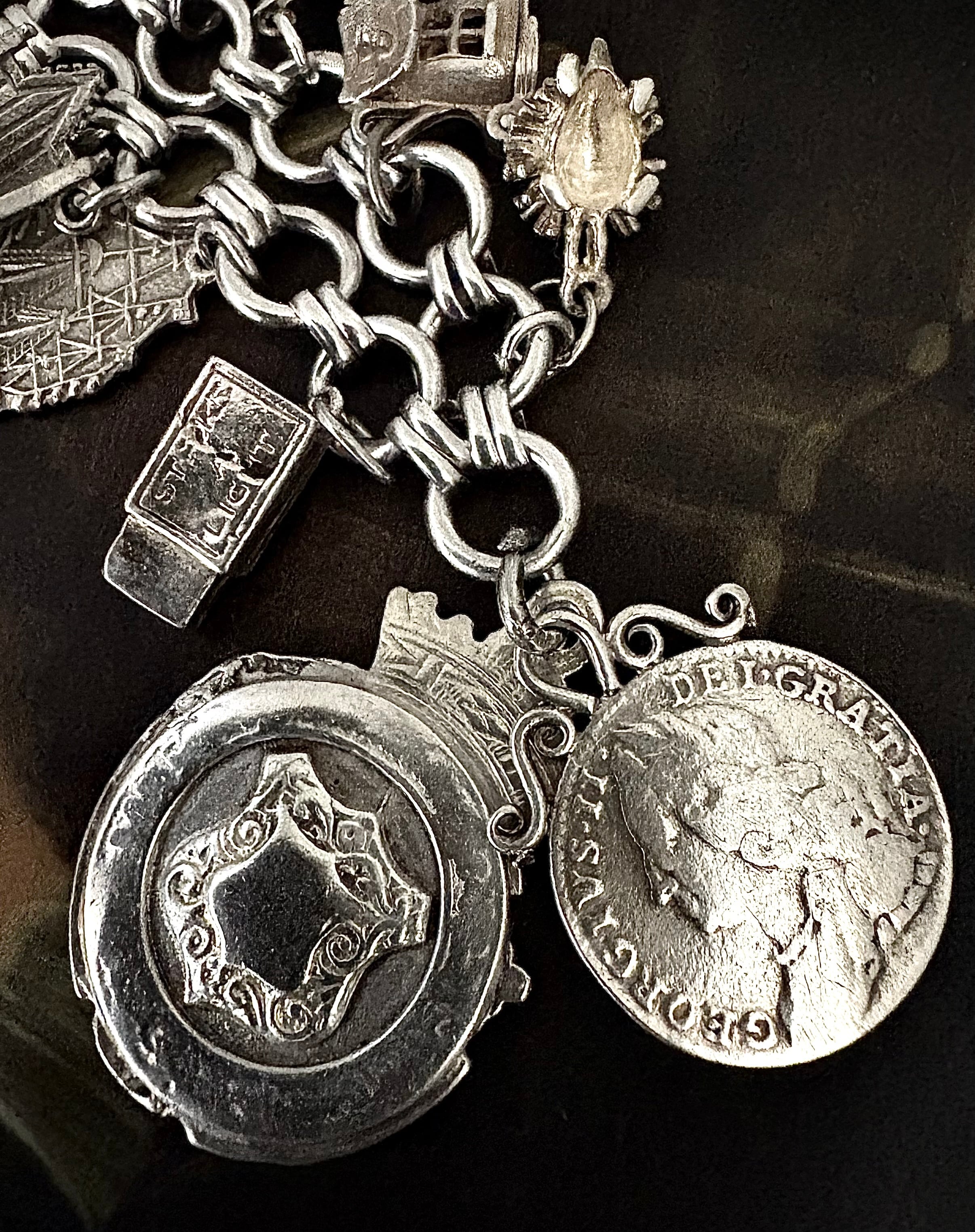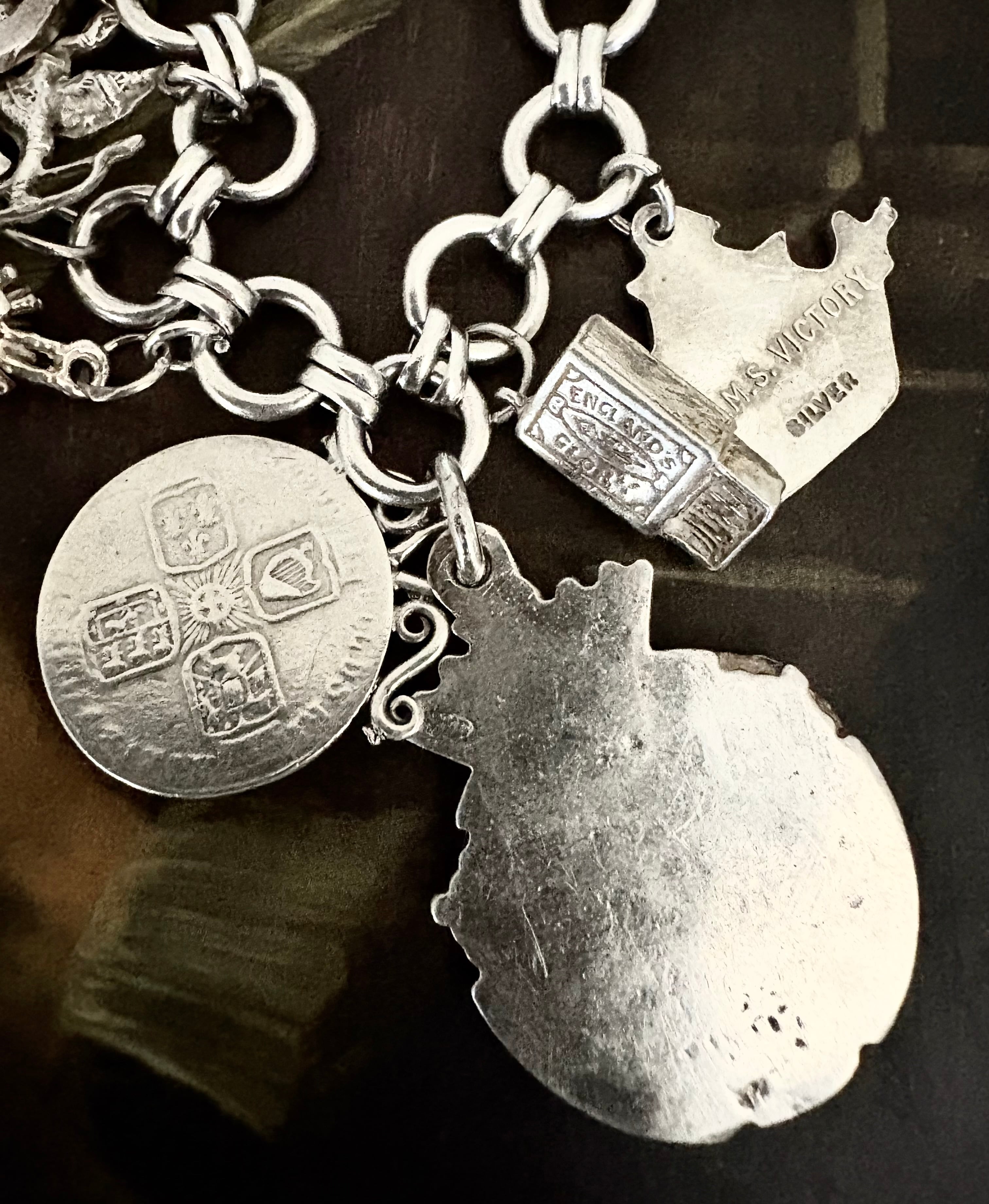 英国ビンテージ チャーム/フォブ シルバー17個 純銀63.3g ブレスレット 銀貨/マッチ箱/ブーツ/アンティークフォブ キングチェア/アニマル/船舶/二輪車 ビンテージアクセサリー メンズファッション アンティークコイン | 英国アンティークマーケット アンカー