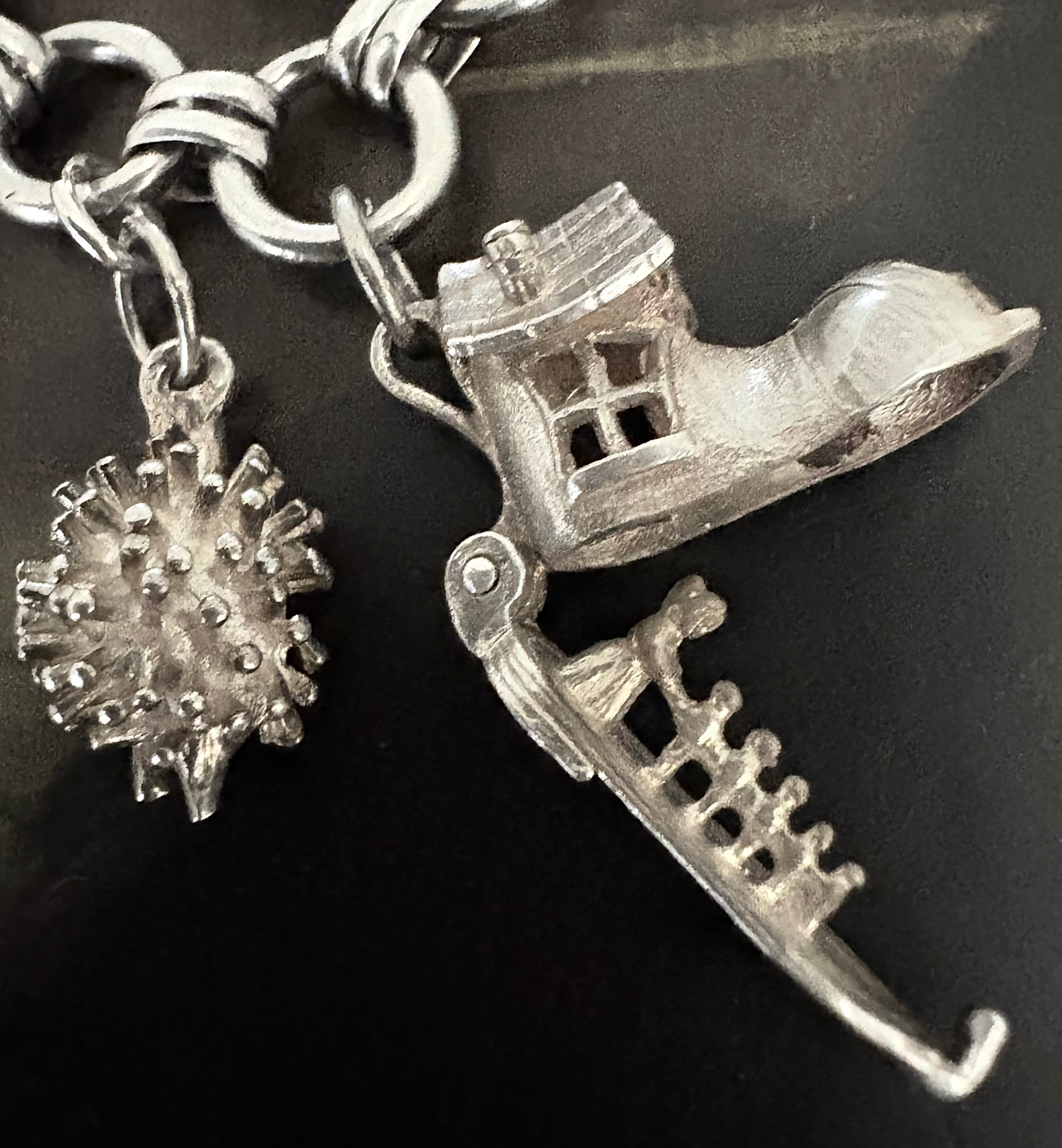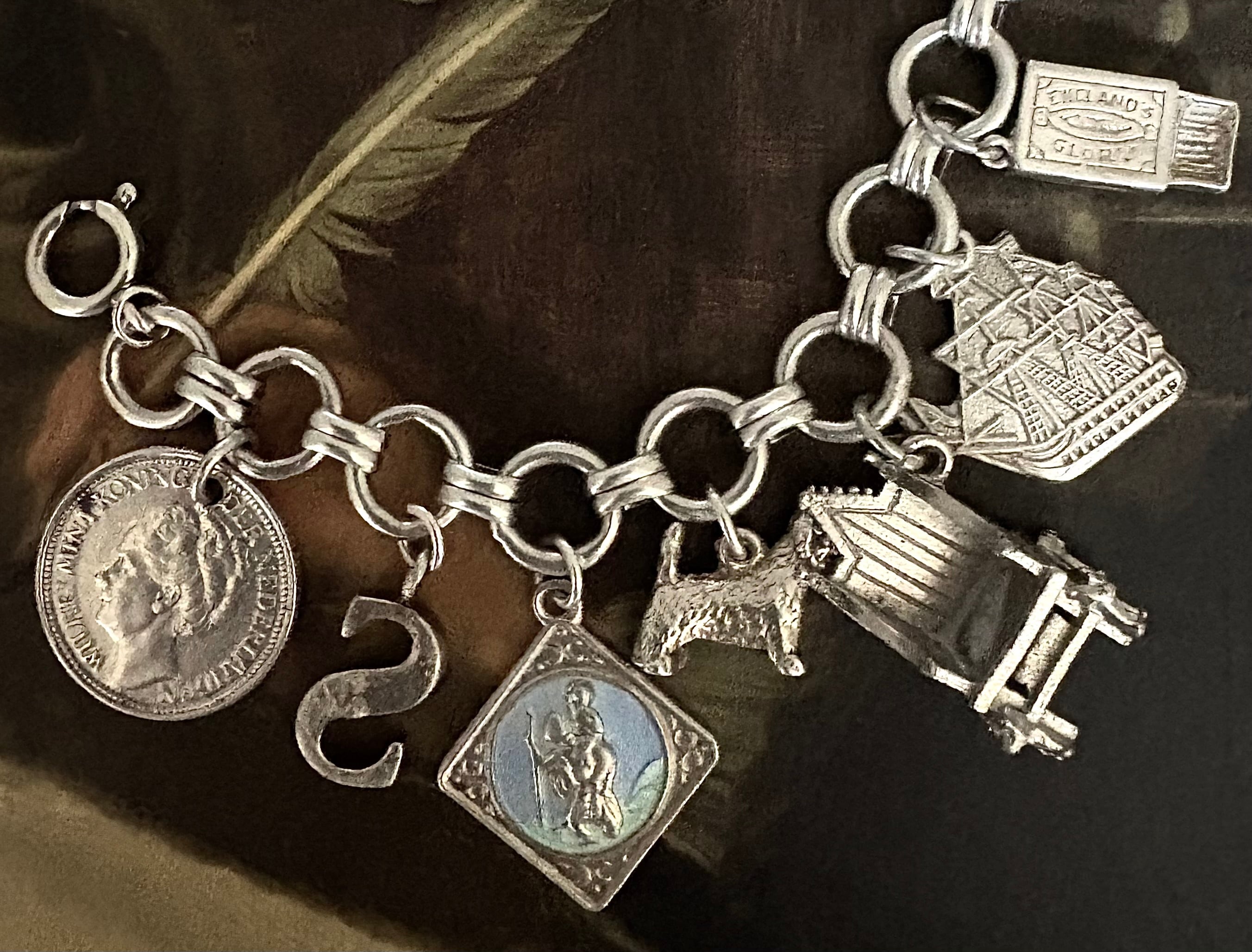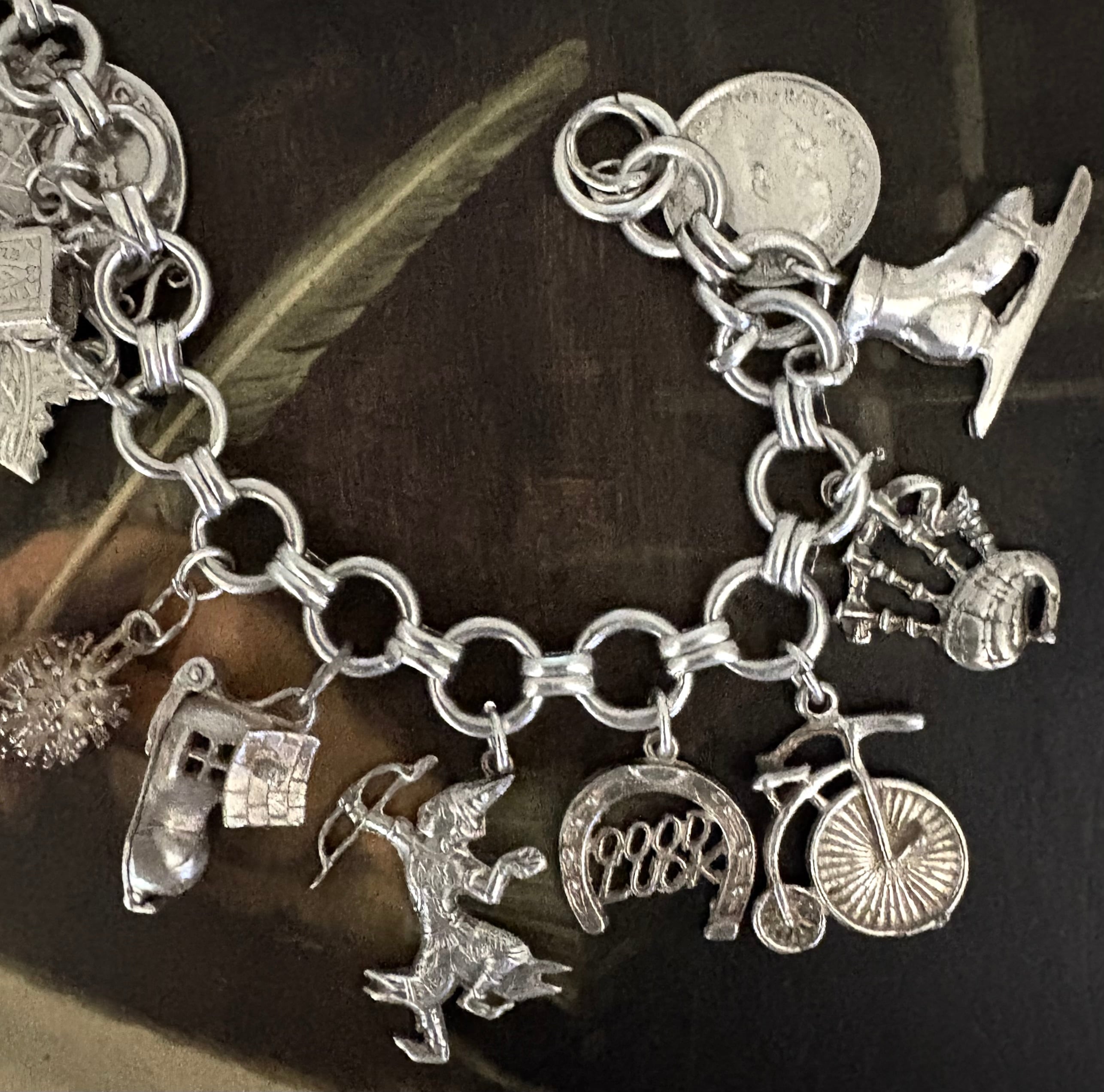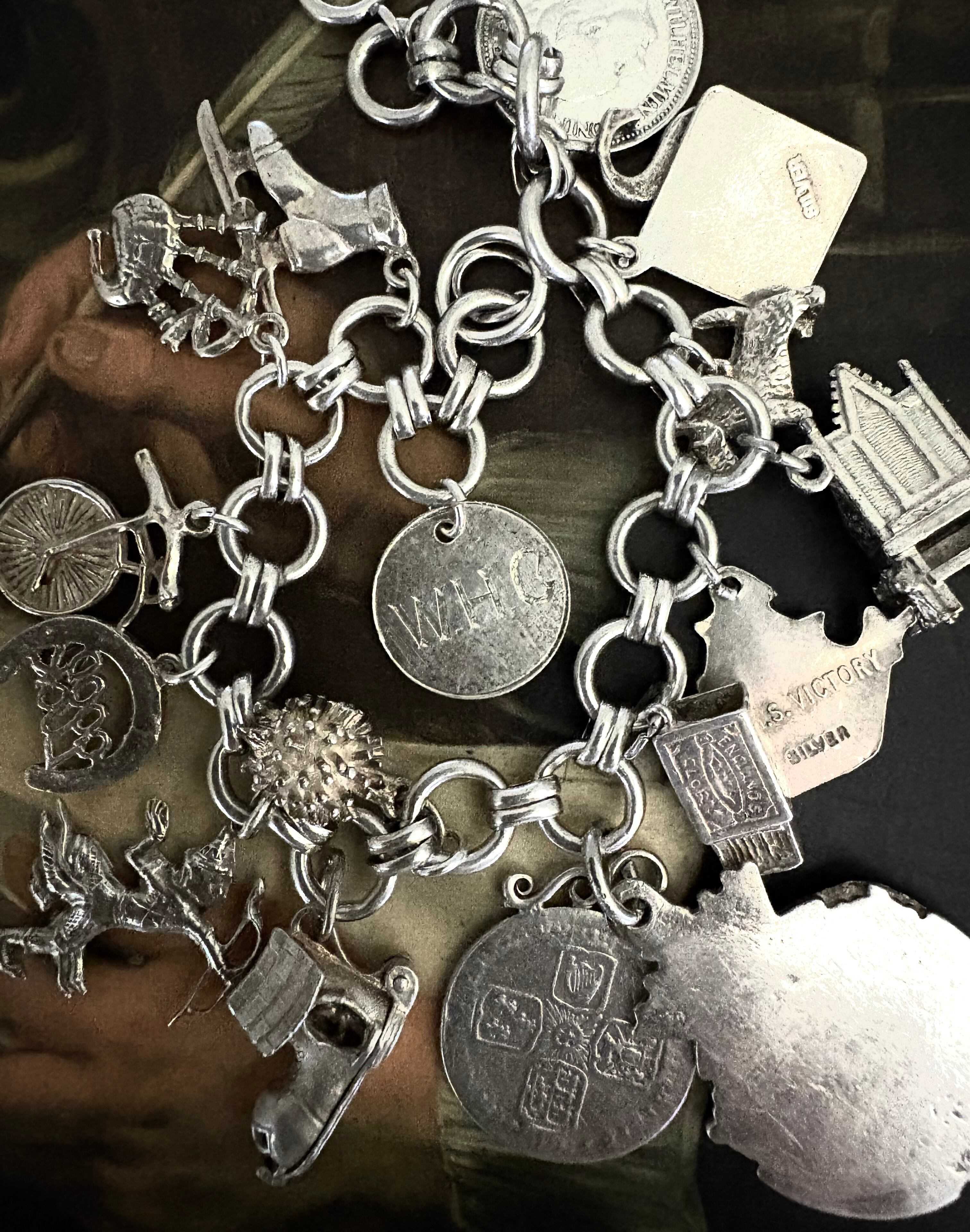 英国ビンテージ チャーム/フォブ シルバー17個 純銀63.3g ブレスレット 銀貨/マッチ箱/ブーツ/アンティークフォブ キングチェア/アニマル/船舶/二輪車 ビンテージアクセサリー メンズファッション アンティークコイン | 英国アンティークマーケット アンカー
