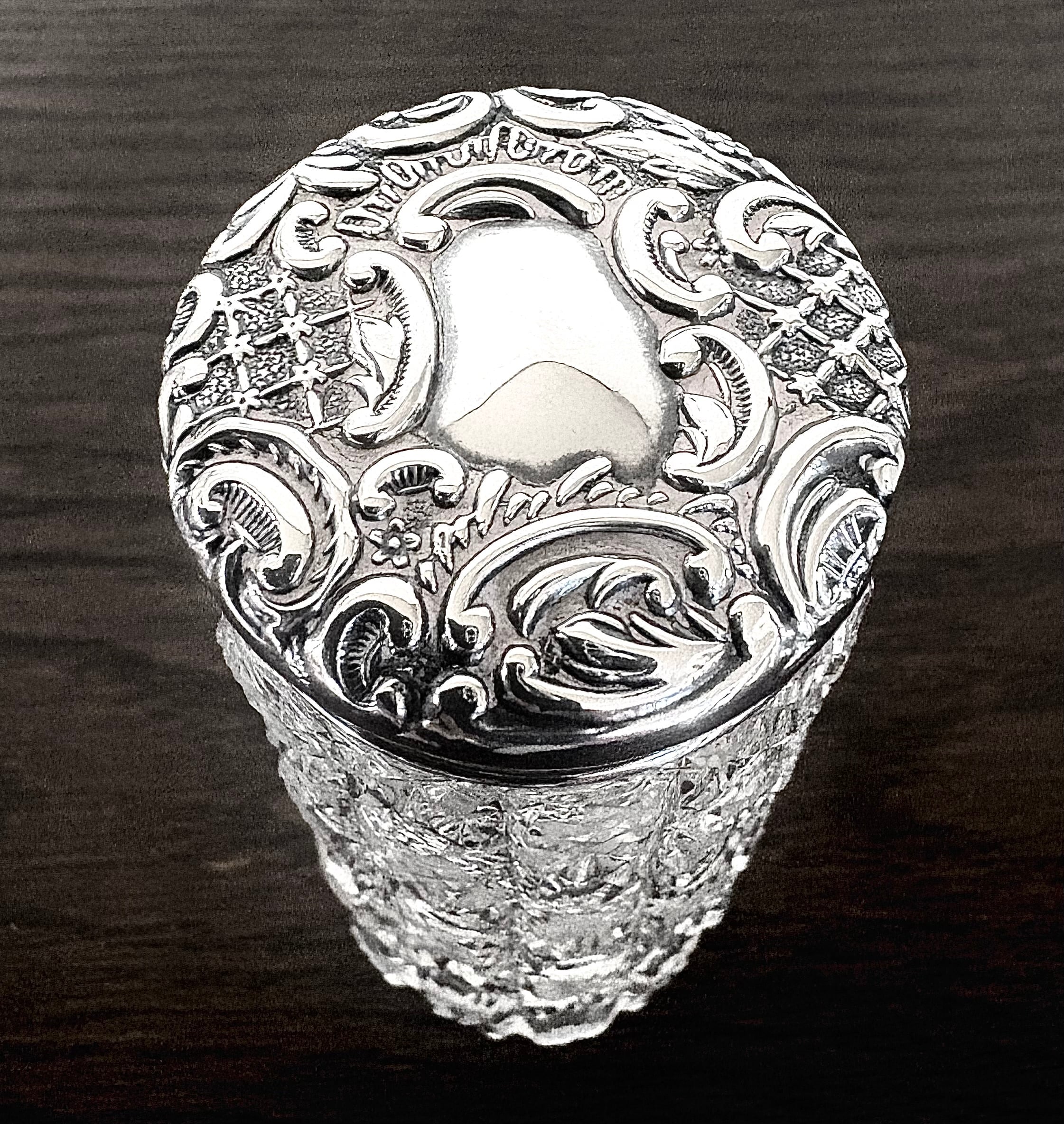 英国アンティーク ガラスケース 円/筒型 草花 彫金装飾 幾何学模様 アールヌーボー ヴァニティー シルバー純銀81.4g ビクトリア期1900年 バーミンガム BG&C社製/Britton, Gould アンティークのある暮らし | 英国アンティークマーケット アンカー