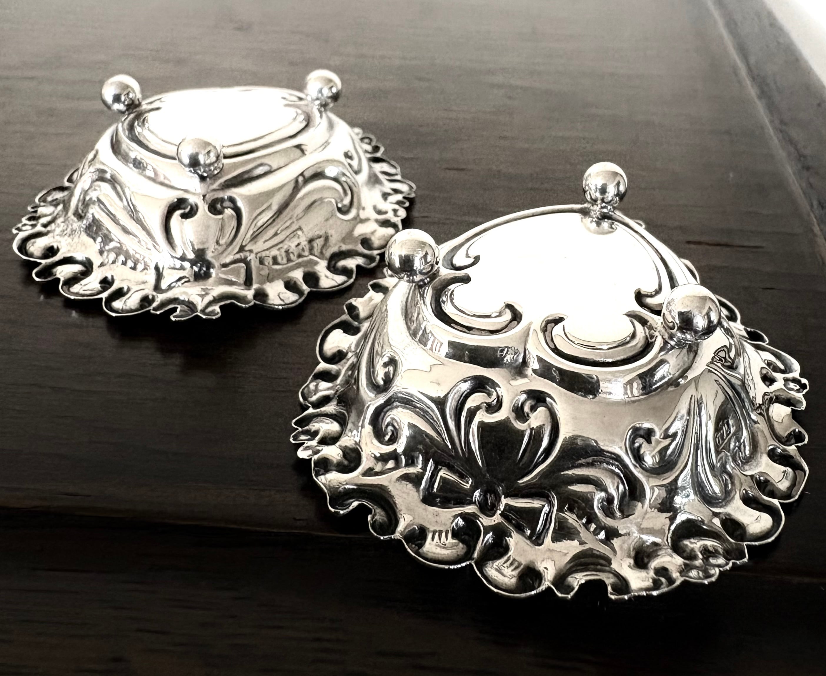 英国アンティーク トリンケット ボンボン・ ディッシュ ペア 小皿2枚 リボン装飾 ハート型 シルバー 純銀26.4g バーミンガム ビクトリア期1897年 William Devenport | 英国アンティークマーケット アンカー