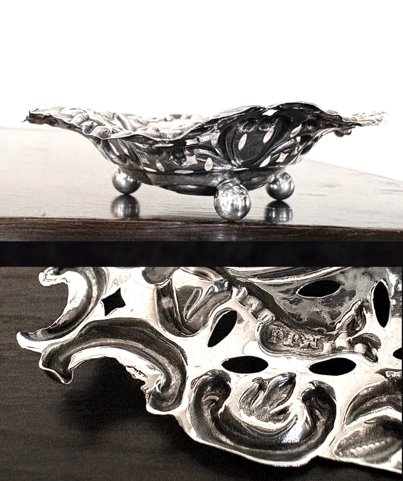 英国アンティーク トリンケット ボンボン・ ディッシュ 透かし文様 リボン装飾 ハート型 シルバー 純銀12.3g バーミンガム ビクトリア期1900年 MJJ社製 英国雑貨 アンティークのある暮らし | 英国アンティークマーケット アンカー