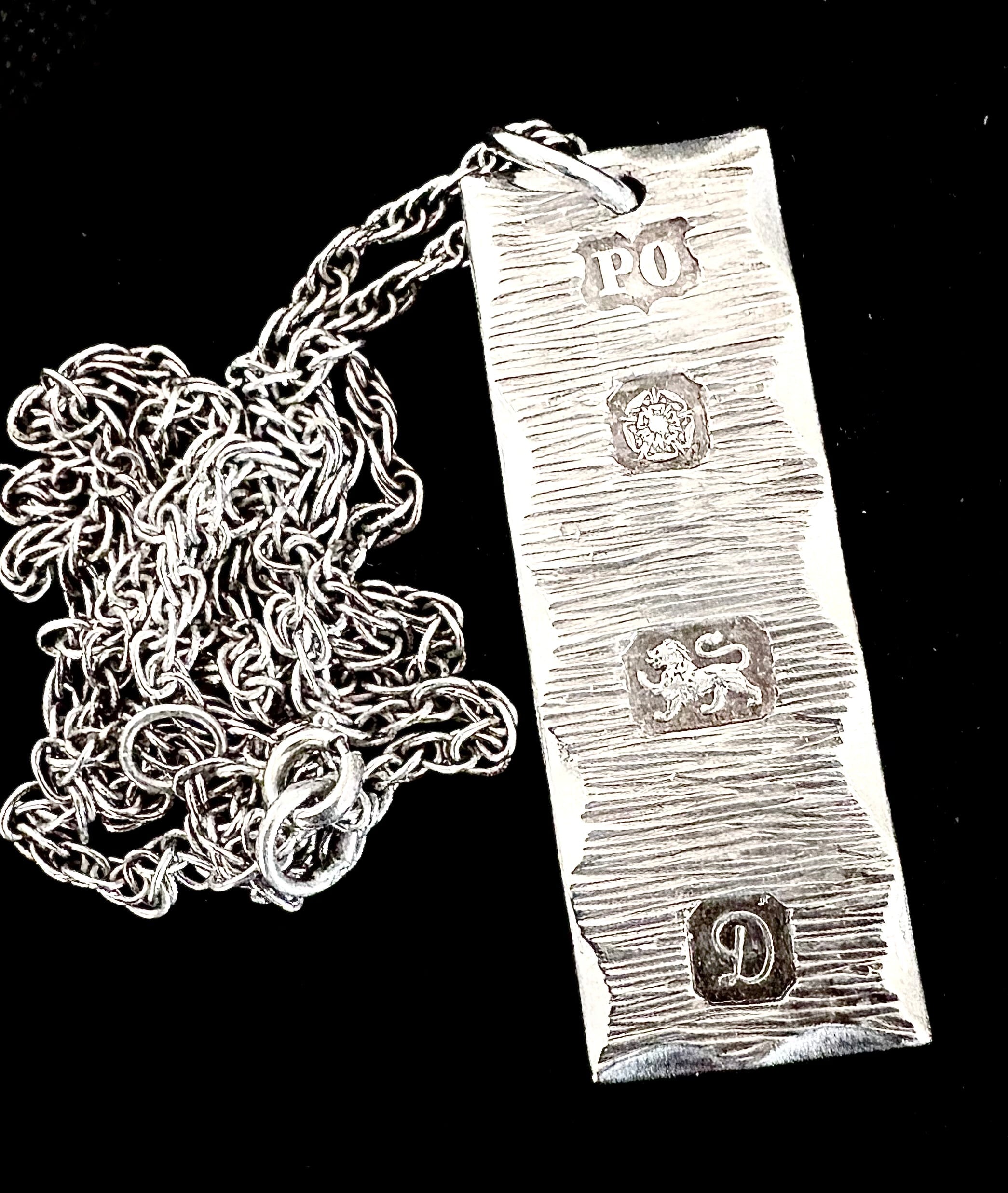 英国ビンテージ インゴット チェーン ロングネックレス ペンダント/フォブ ヘビーシルバー925純銀37.6g 58cm 1978年シェフィールド PO社製 シルバーホールマーク メンズファッション 紳士