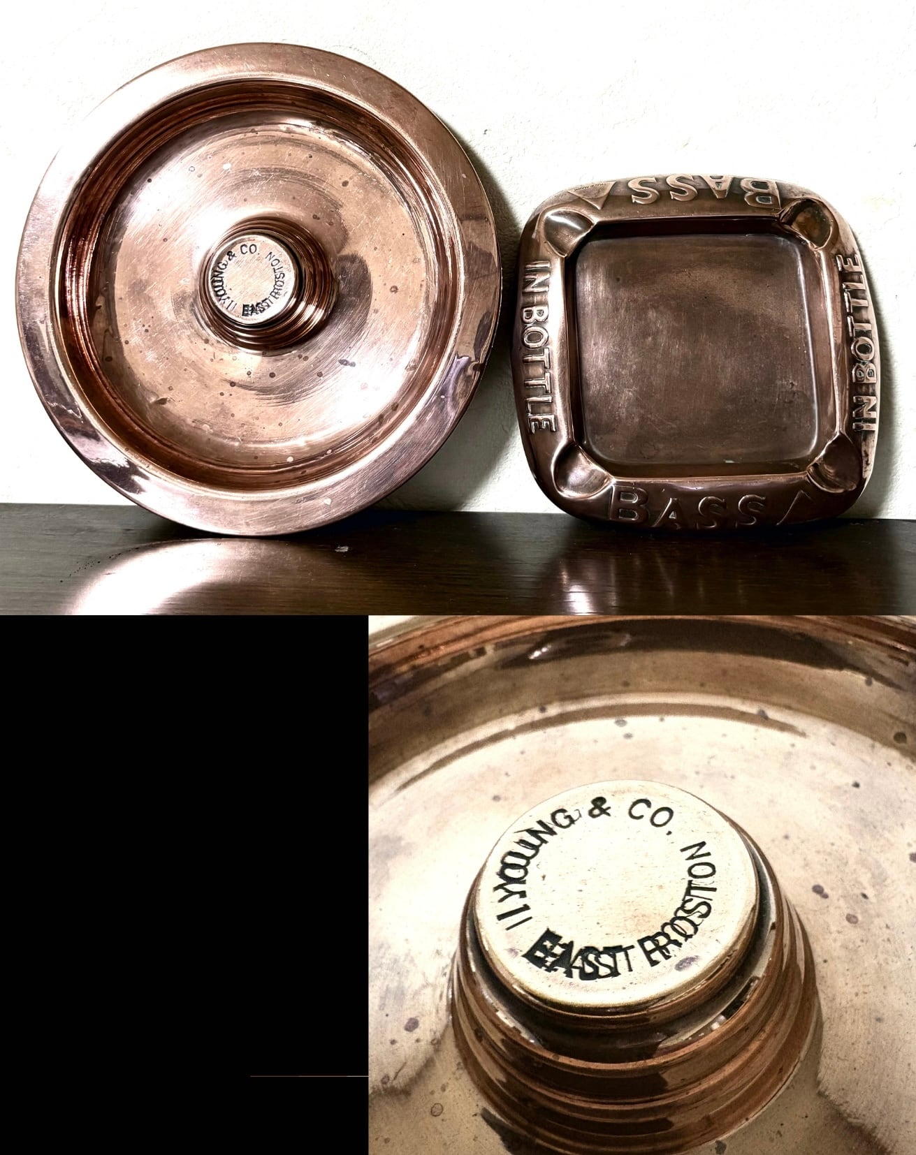 英国ビンテージ 円型大/I YOUNG&Co BOSTON 角型/BASS 銅製 ビール醸造会社 COPPER 灰皿2点シガー葉巻 アッシュ・トレイ BAR用品 英国雑貨 | 英国アンティークマーケット アンカー