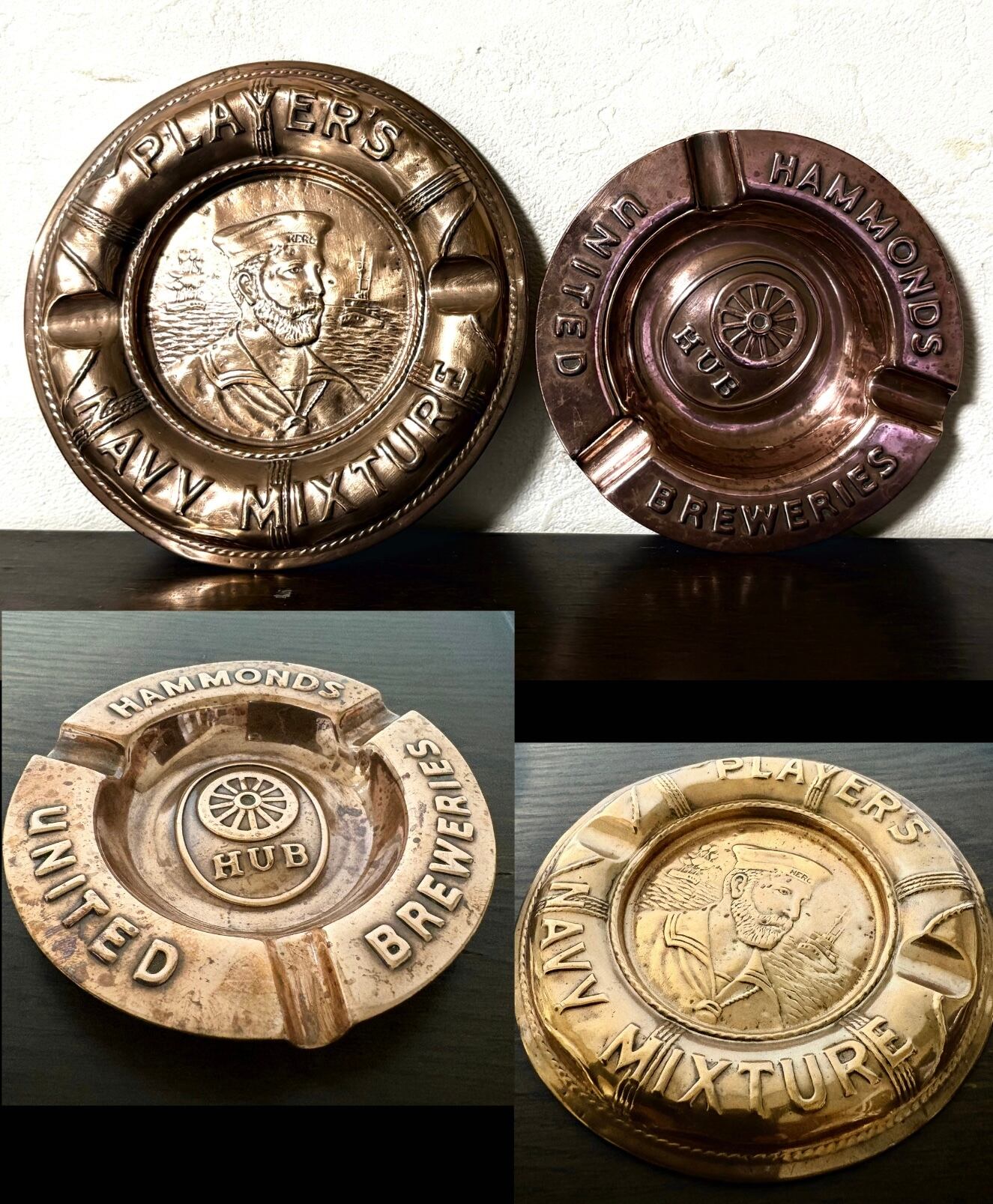 英国ビンテージ 円型/NAVY PLAYER/船舶 HAMMONDS UNITED/ビール醸造会社 銅製/COPPER 灰皿2点 シガー葉巻 アッシュ・トレイ BAR用品 英国雑貨 | 英国アンティークマーケット アンカー