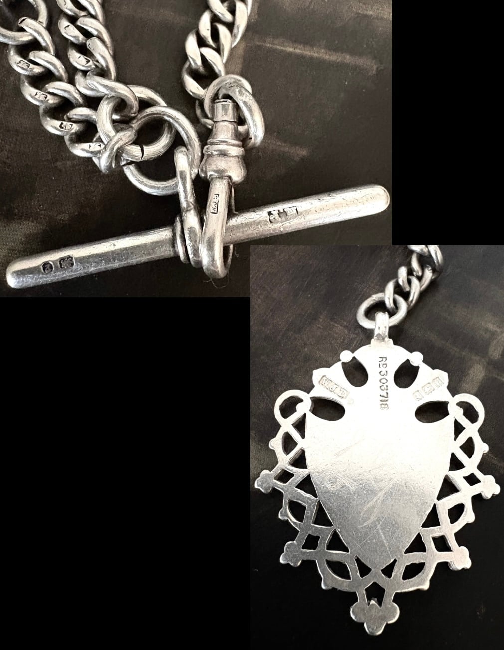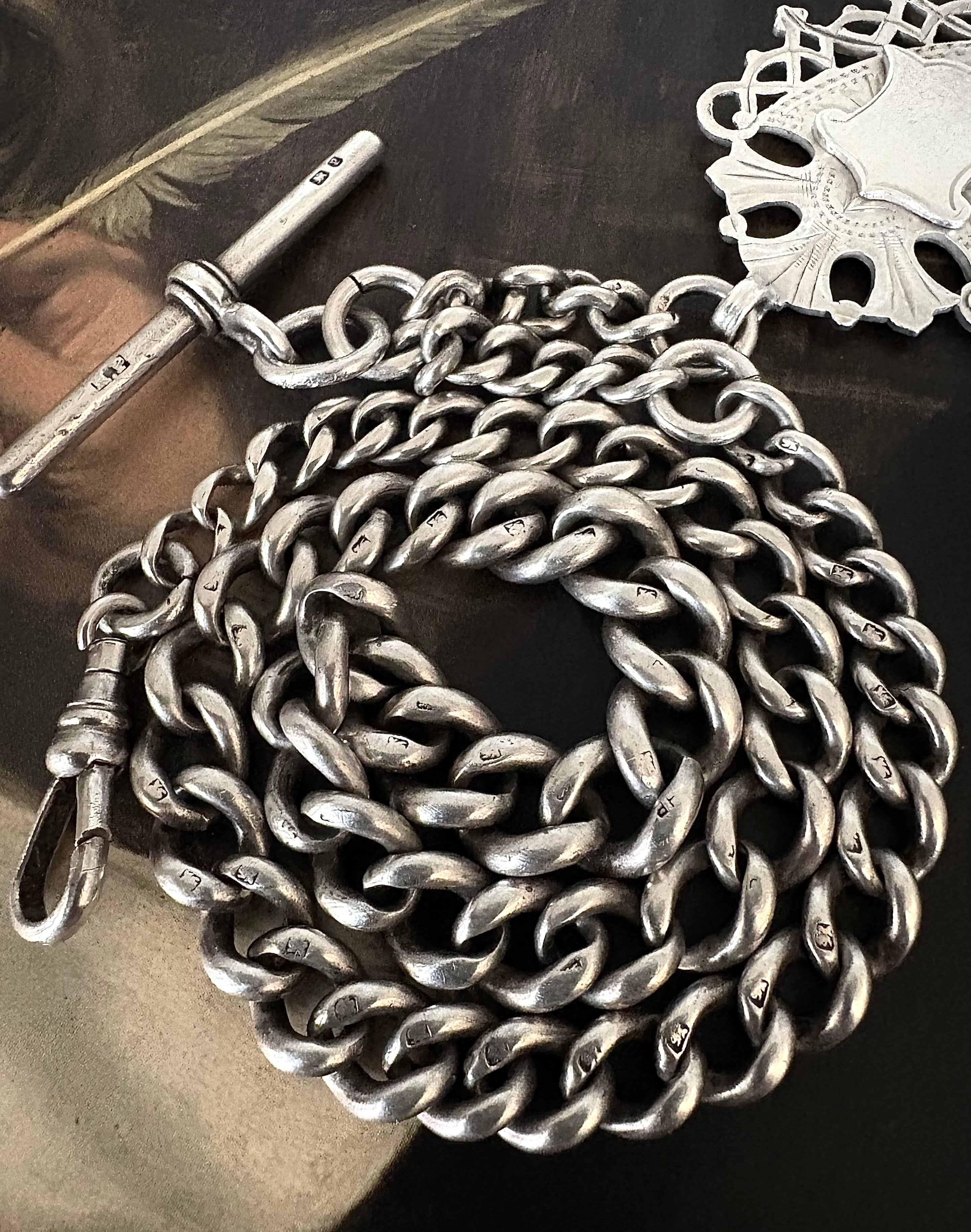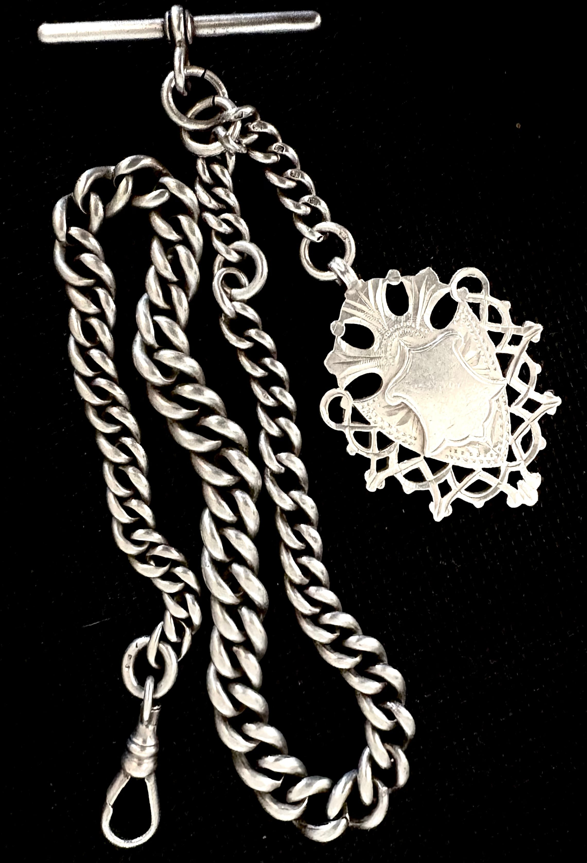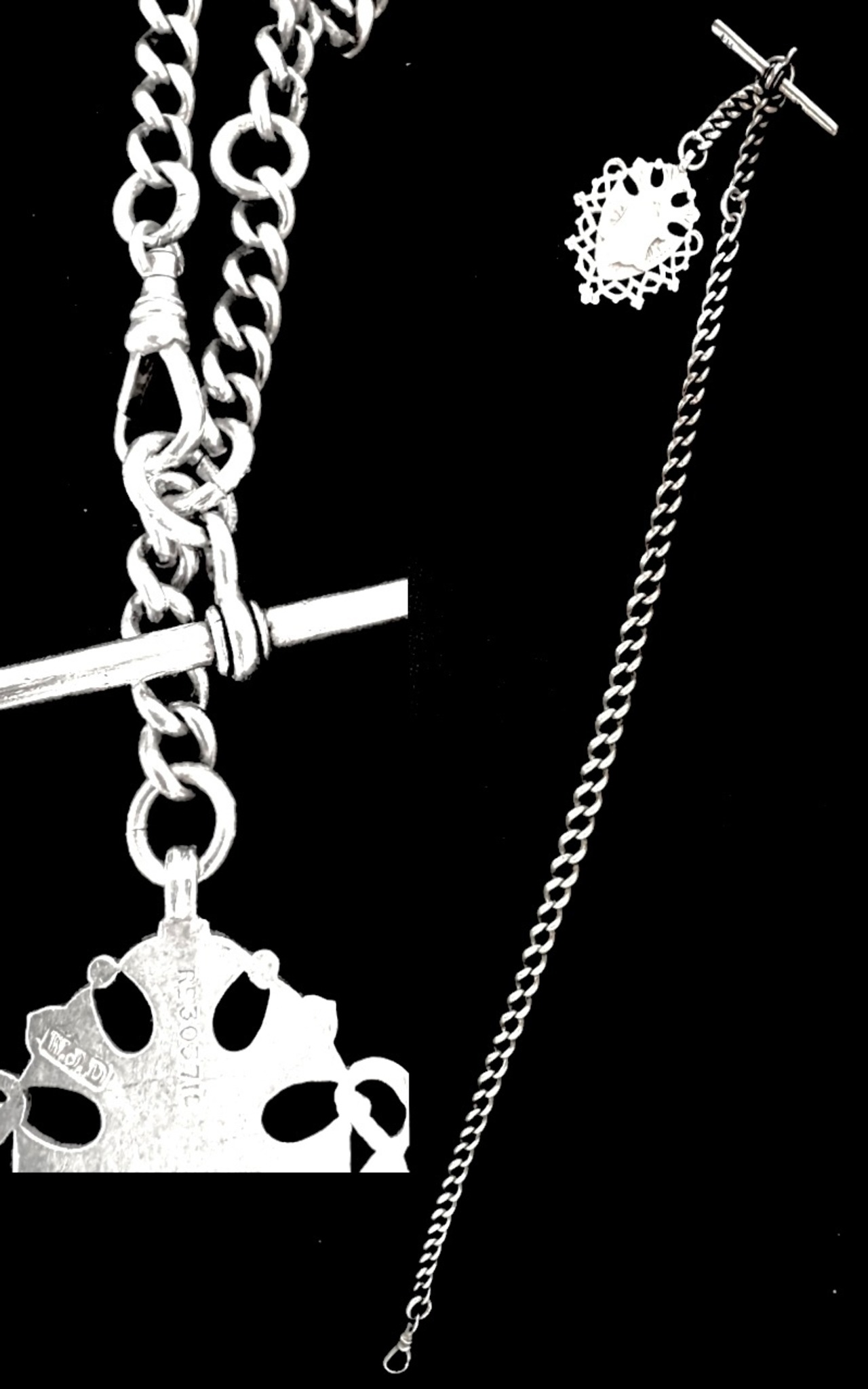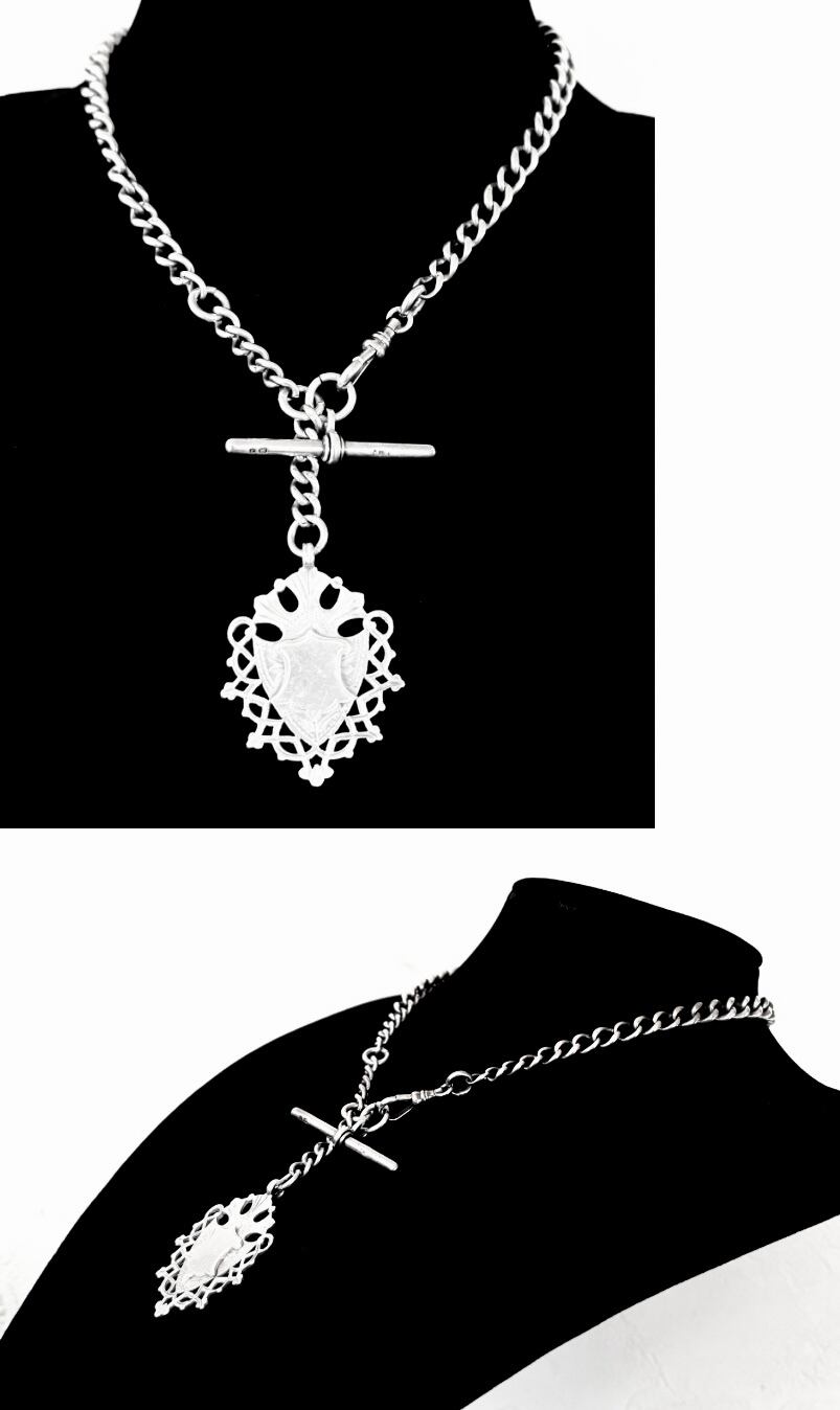 英国アンティーク 透かし文様/フィリグリー装飾フォブ シングルロング ペンダントネックレス 懐中時計/アルバートチェーン シルバー純銀49.5g 1900年前後 バーミンガム WJD社製 ガード/ウオッチ コレクターズ Britishmade