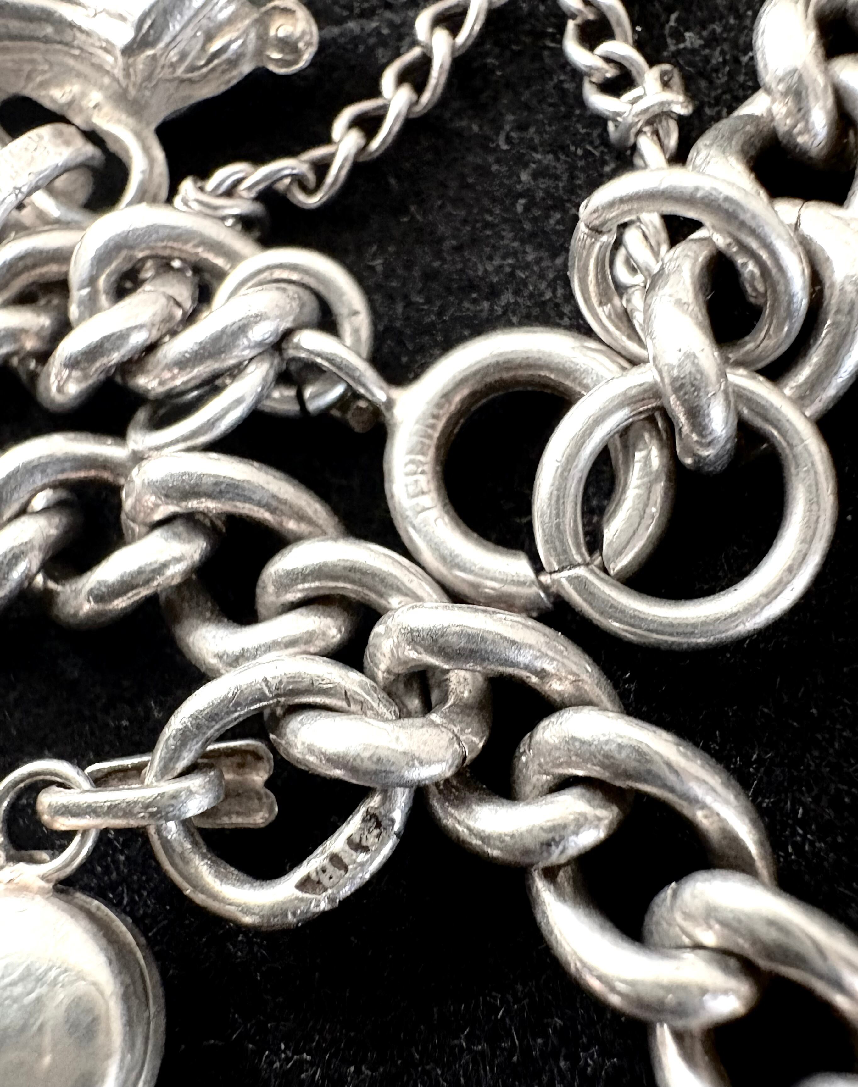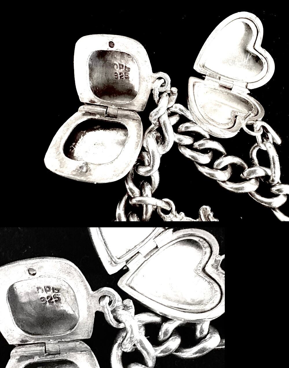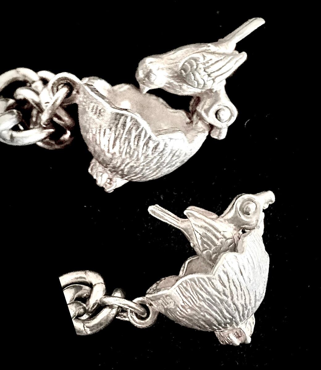 英国ビンテージ ブレスレット 鳥の巣/ロケット/ティーカップ&スプーン チャーム セーフティーチェーン オープンワーク シルバー 純銀36.6g ビンテージファッション ラッキーチャーム
