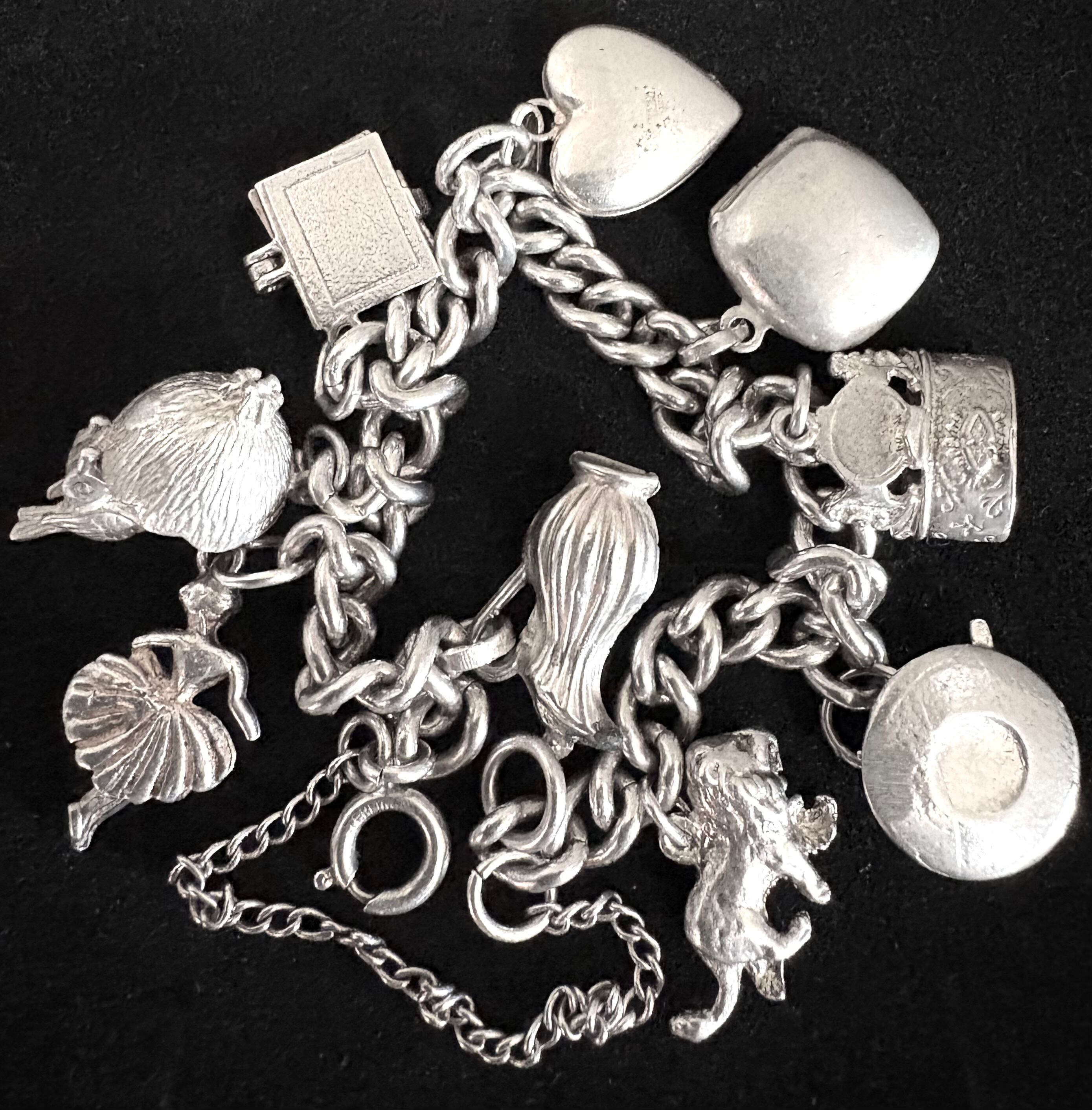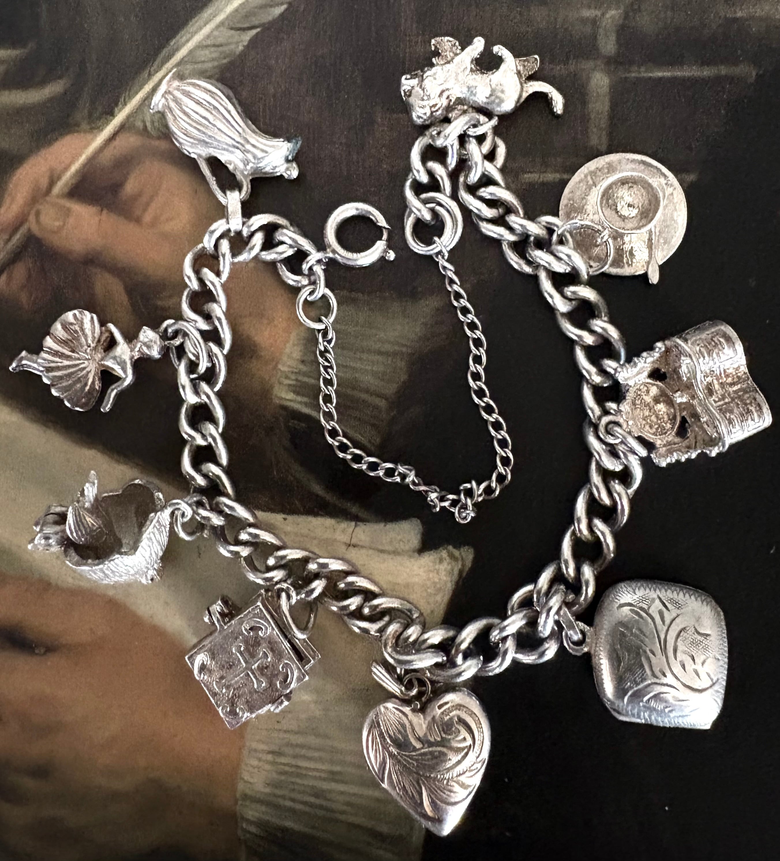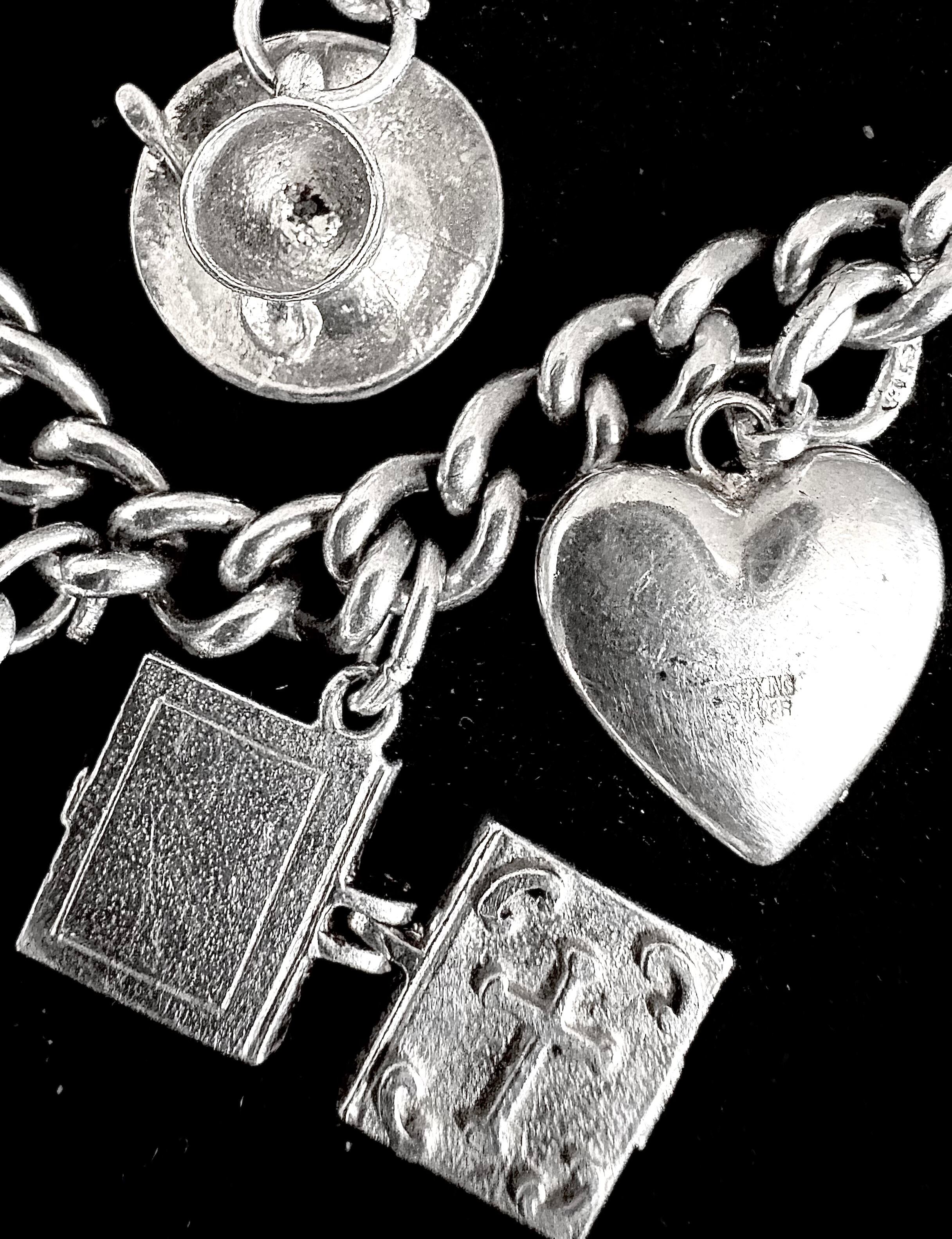 英国ビンテージ ブレスレット 鳥の巣/ロケット/ティーカップ&スプーン チャーム セーフティーチェーン オープンワーク シルバー 純銀36.6g ビンテージファッション ラッキーチャーム