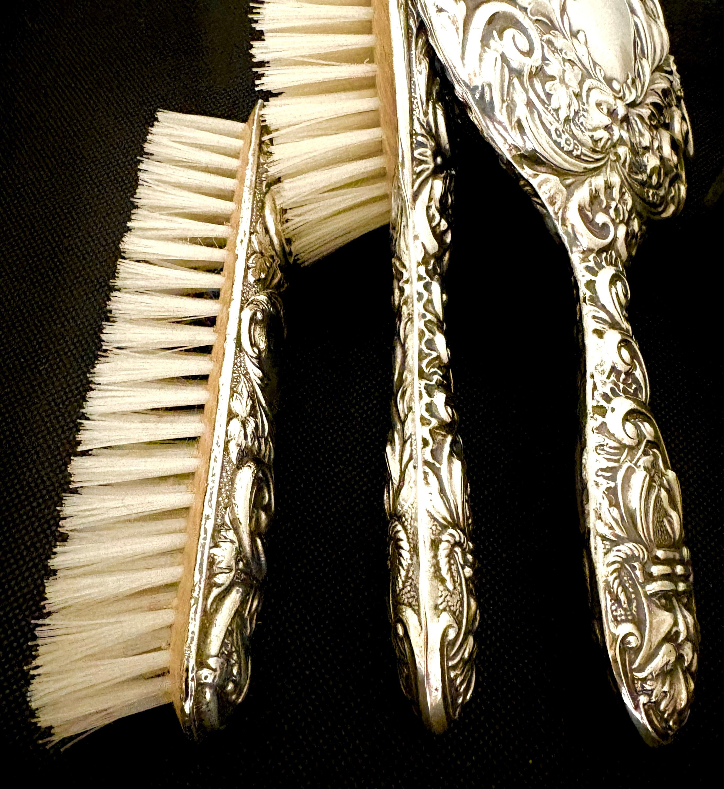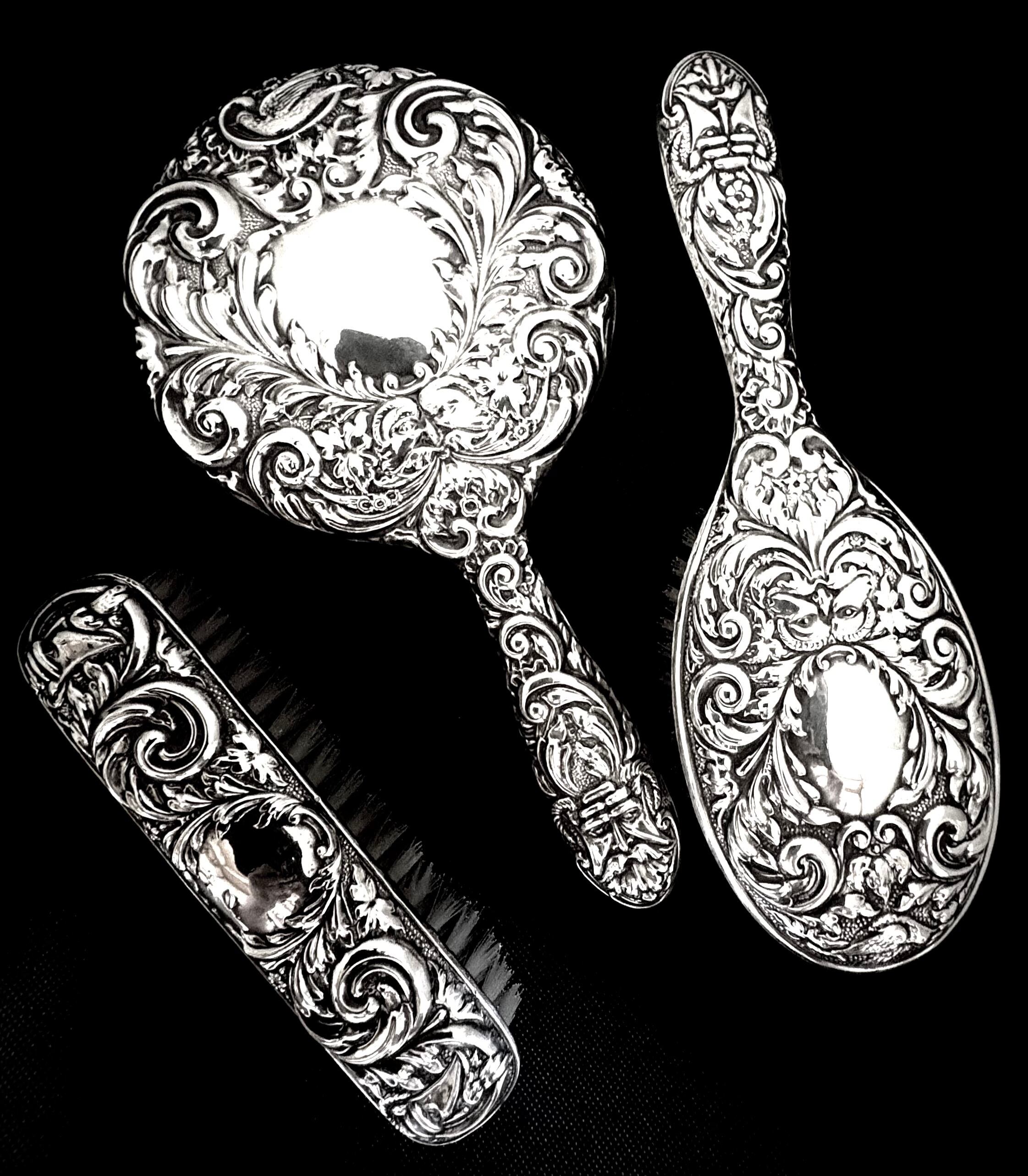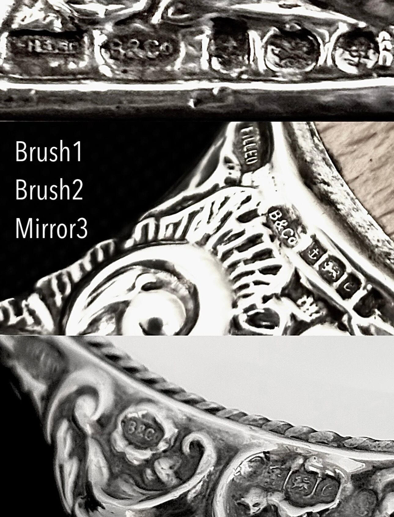 英国ビンテージ 手鏡&ブラシ 大型 ヴァニティ 3点セット ハンドミラー シルバー純銀 1970年代 B&Co社製 英国雑貨 英国スタイル ディスプレイ コレクターズ Broadway Co Solid Silver Three Piece Vanity Set Hand Mirror & Brushes