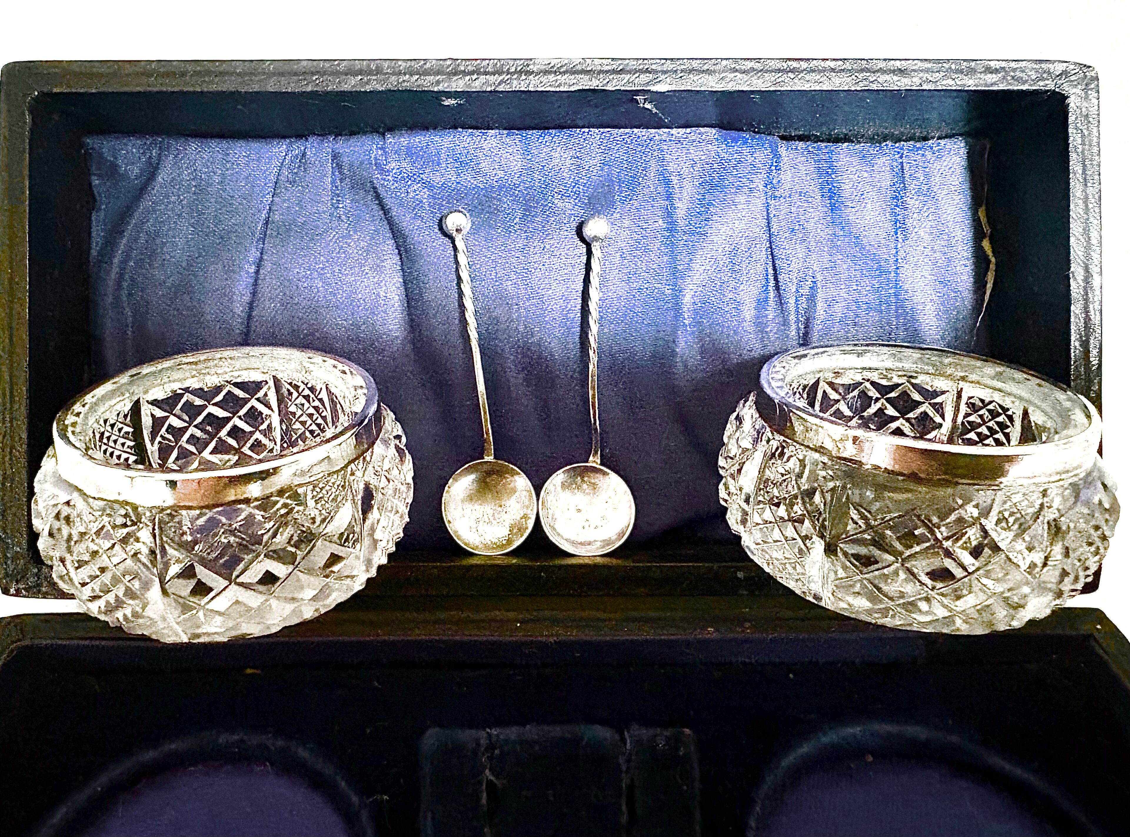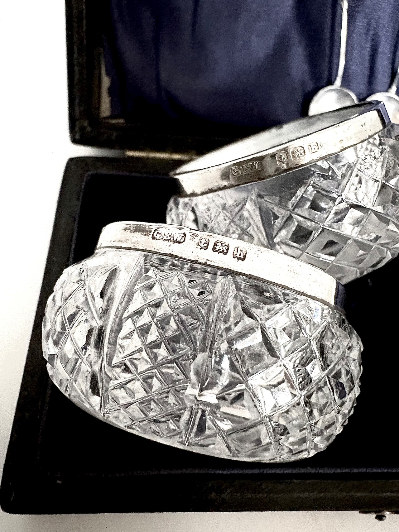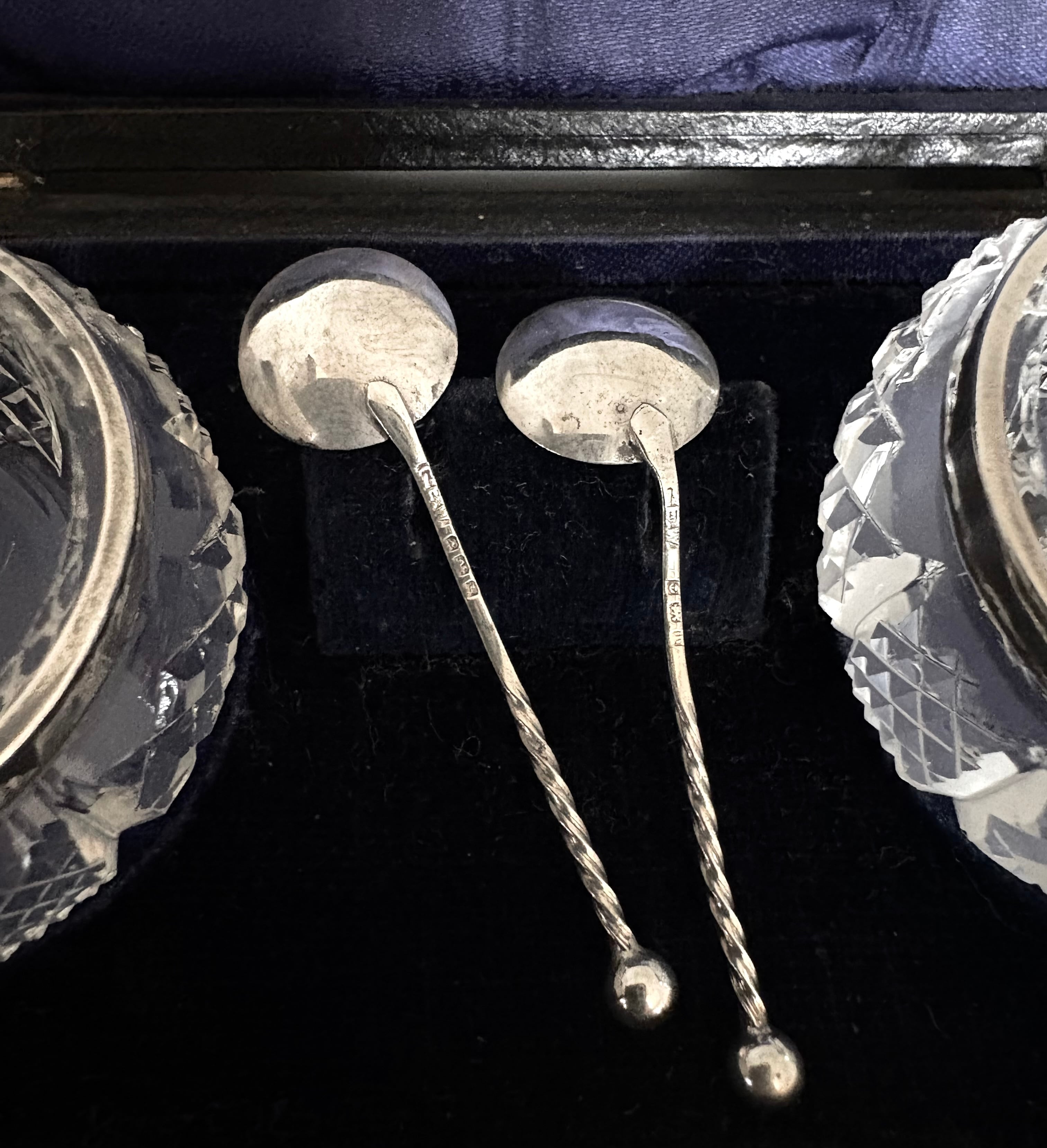 英国アンティーク ソルト&ペッパーポット スプーン カトラリ― 調味料入れ4点セット元箱 ガラス&シルバー純銀 バーミンガム 1907年 G.E.W社製 アフタヌーンティー アンティークコレクション