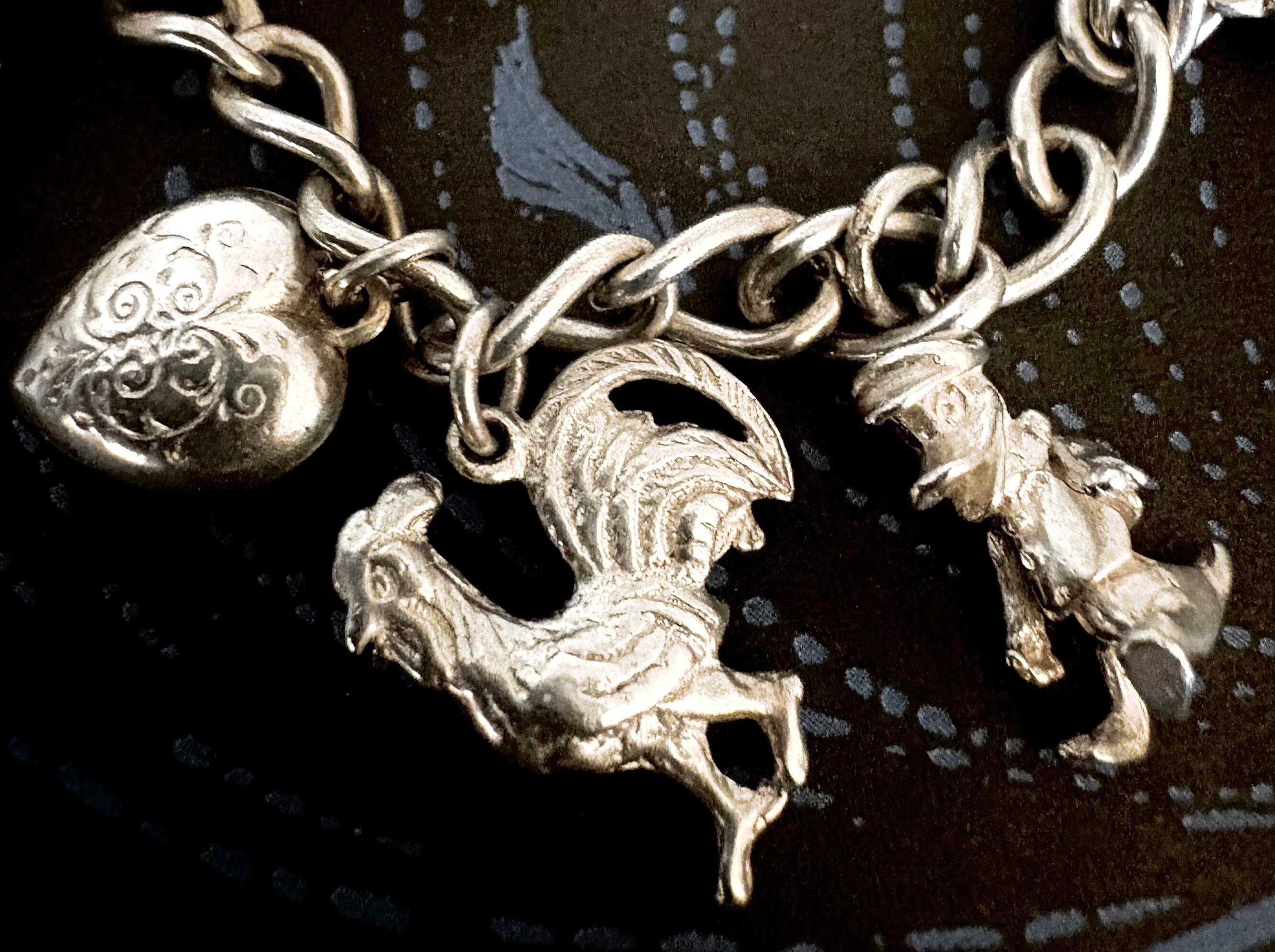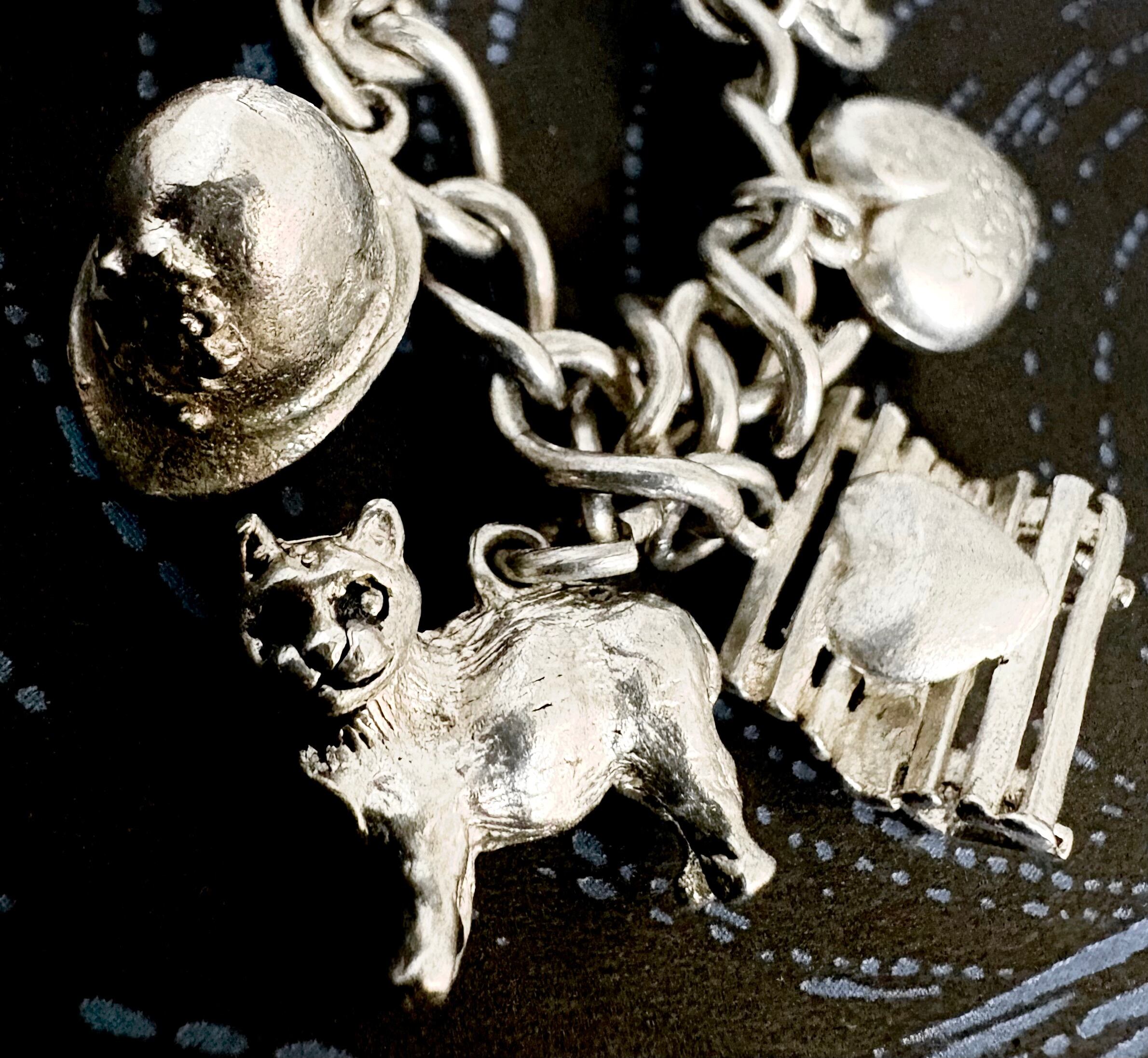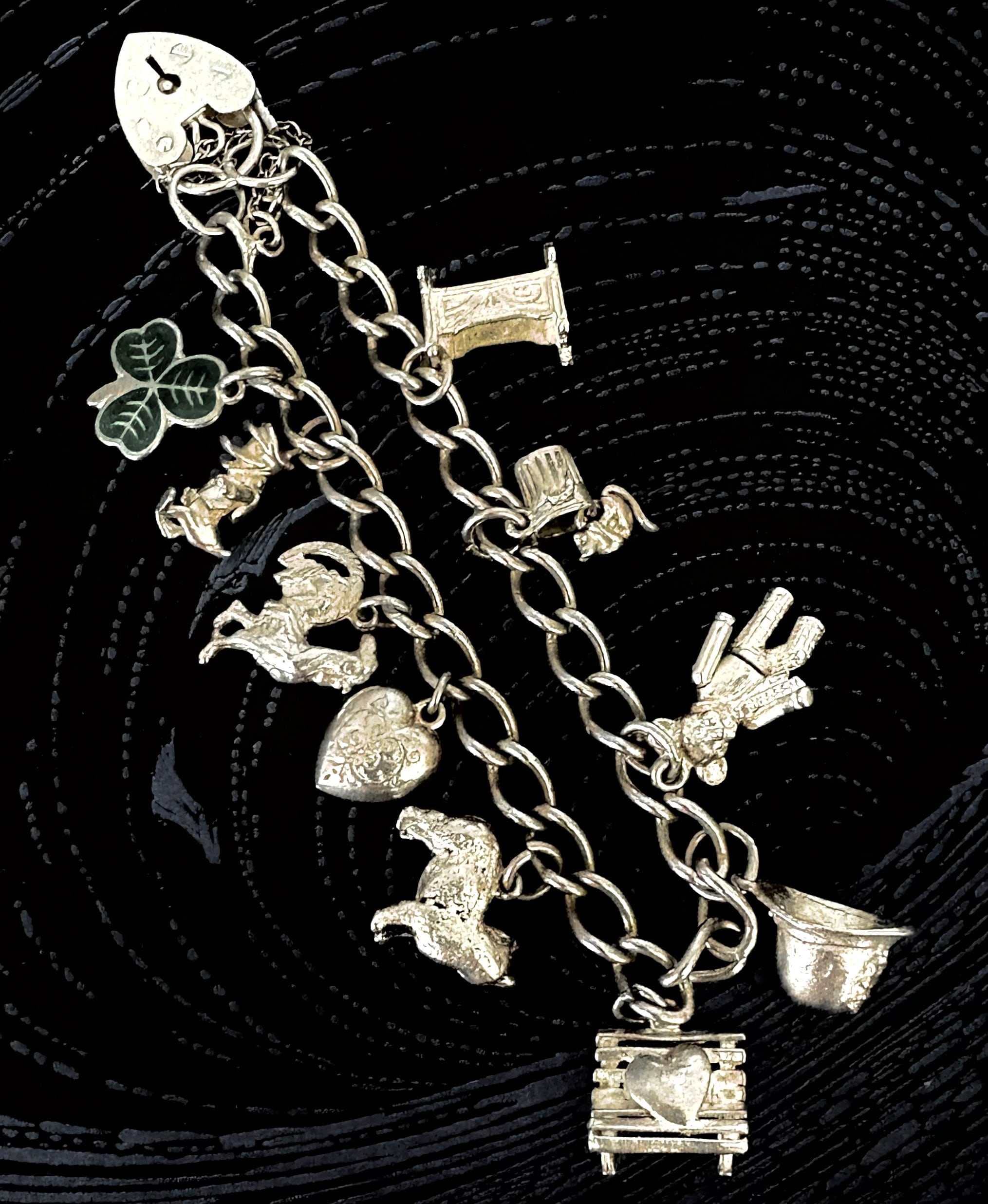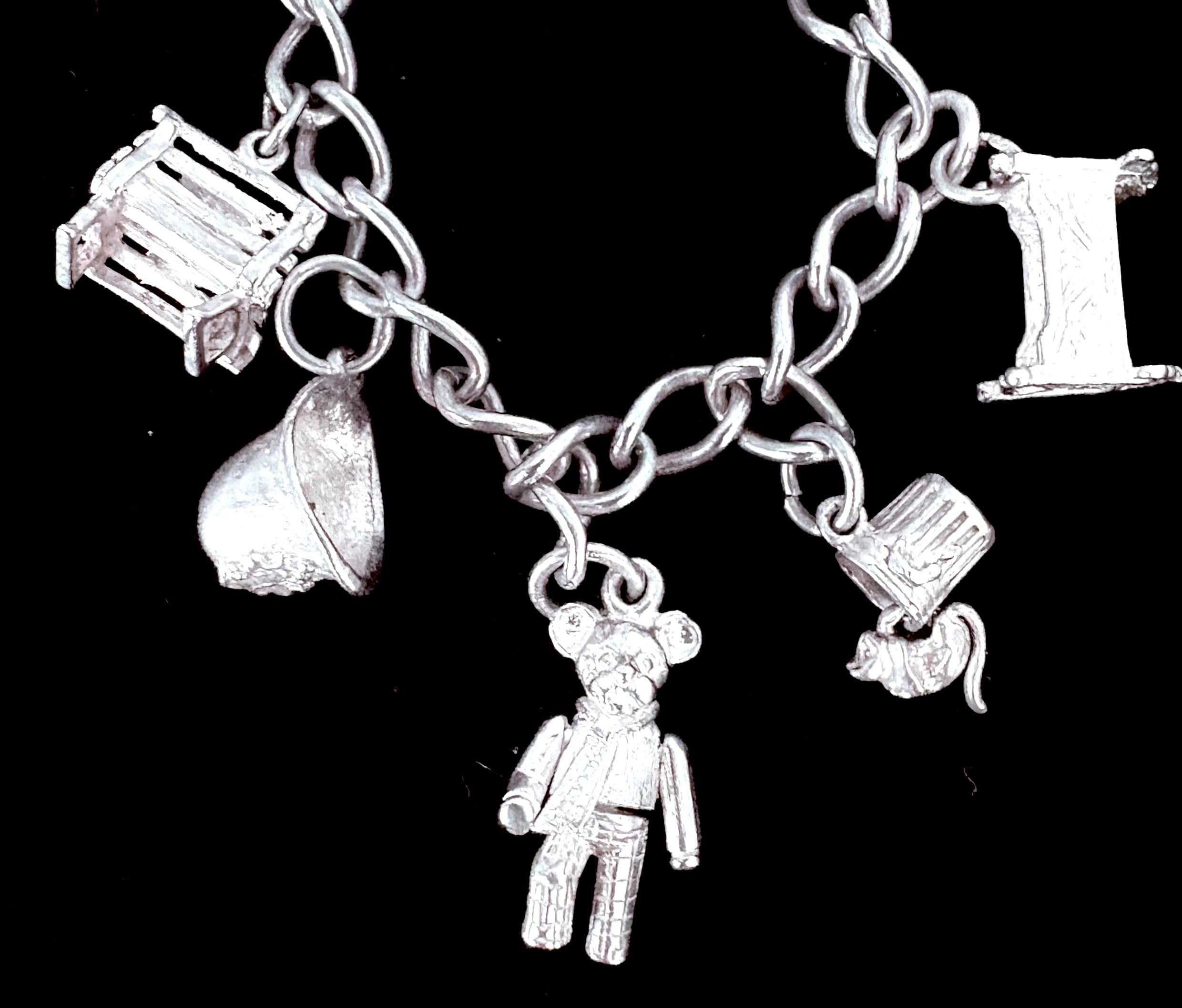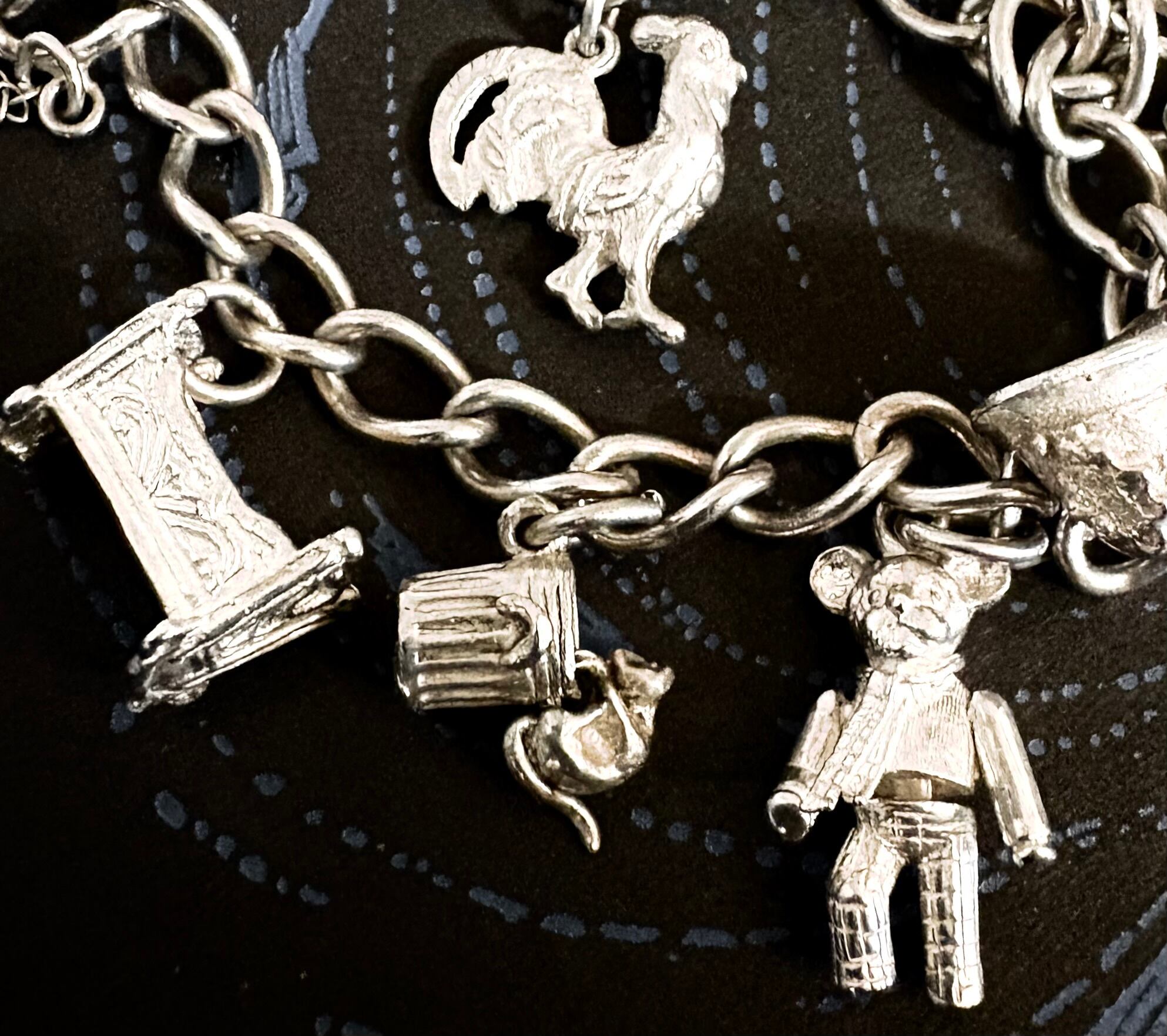英国ビンテージ テディベア/ウッドペッカー/警察帽/ゆりかご/クローバー ラッキーチャームブレスレット 10個 シルバー純銀26.6g/18cm セーフティーチェーン パドロック ロンドン1979年社 ASJ社製