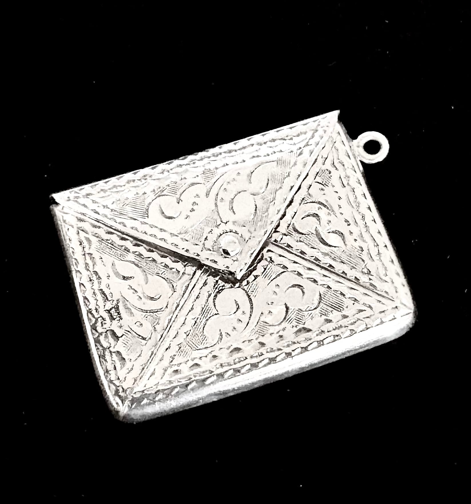 英国アンティーク 切手 封筒型 両面装飾 スタンプケース/ホルダー フォブ ペンダント シルバー純銀4.4g バーミンガム1906年 エドワード期 A&LL社製 H SAMUEL ジュエラーボックス付き