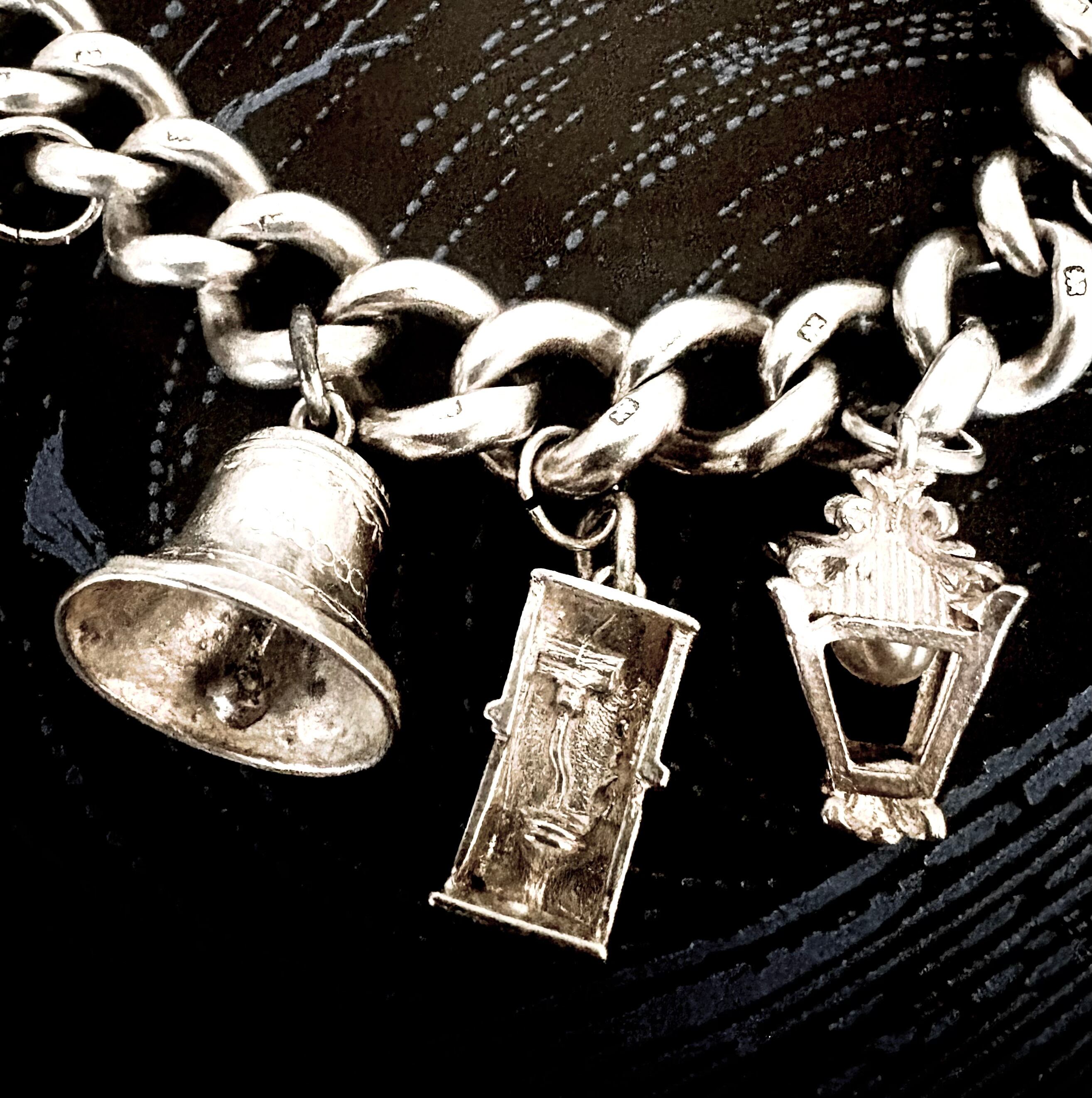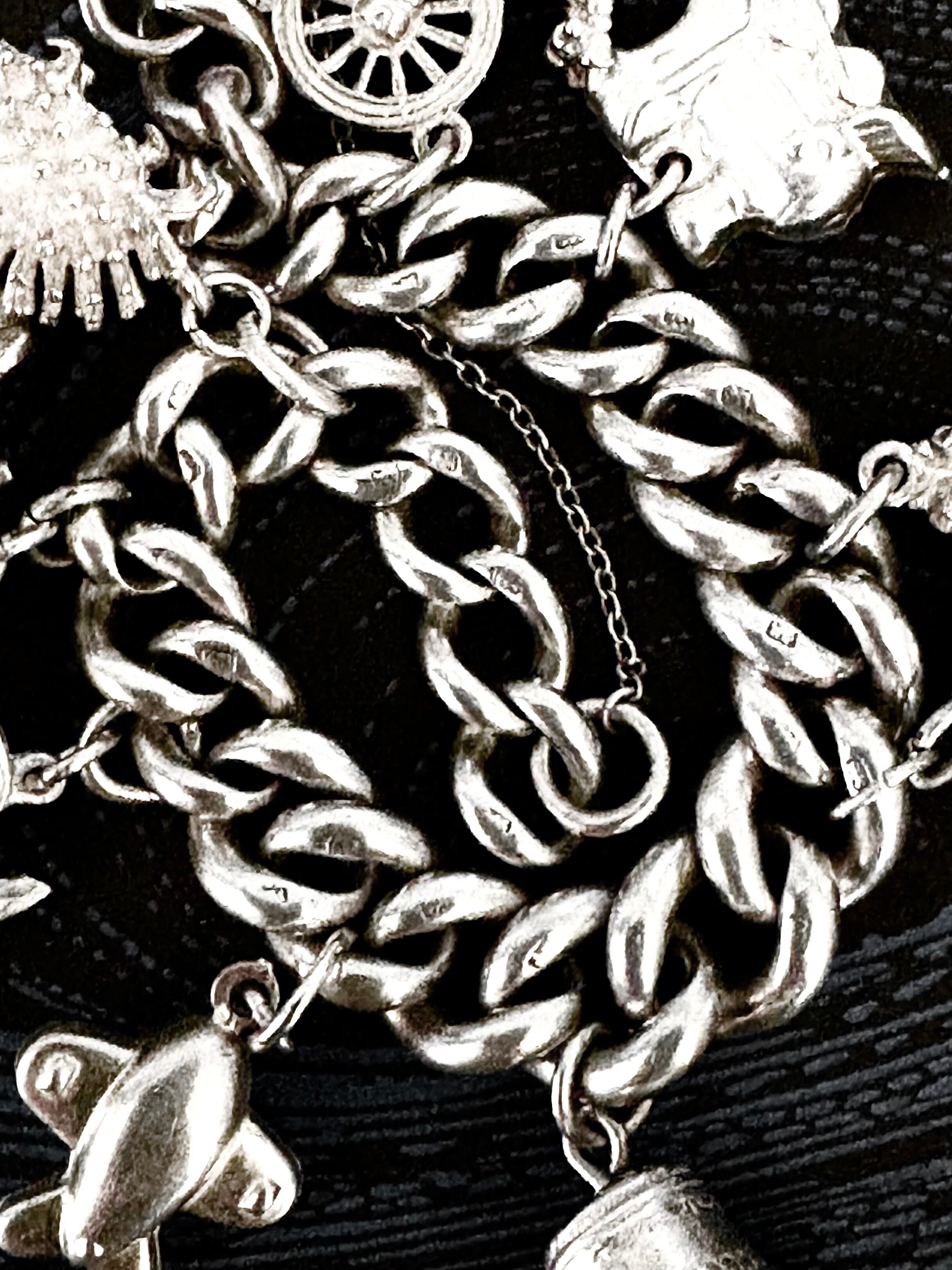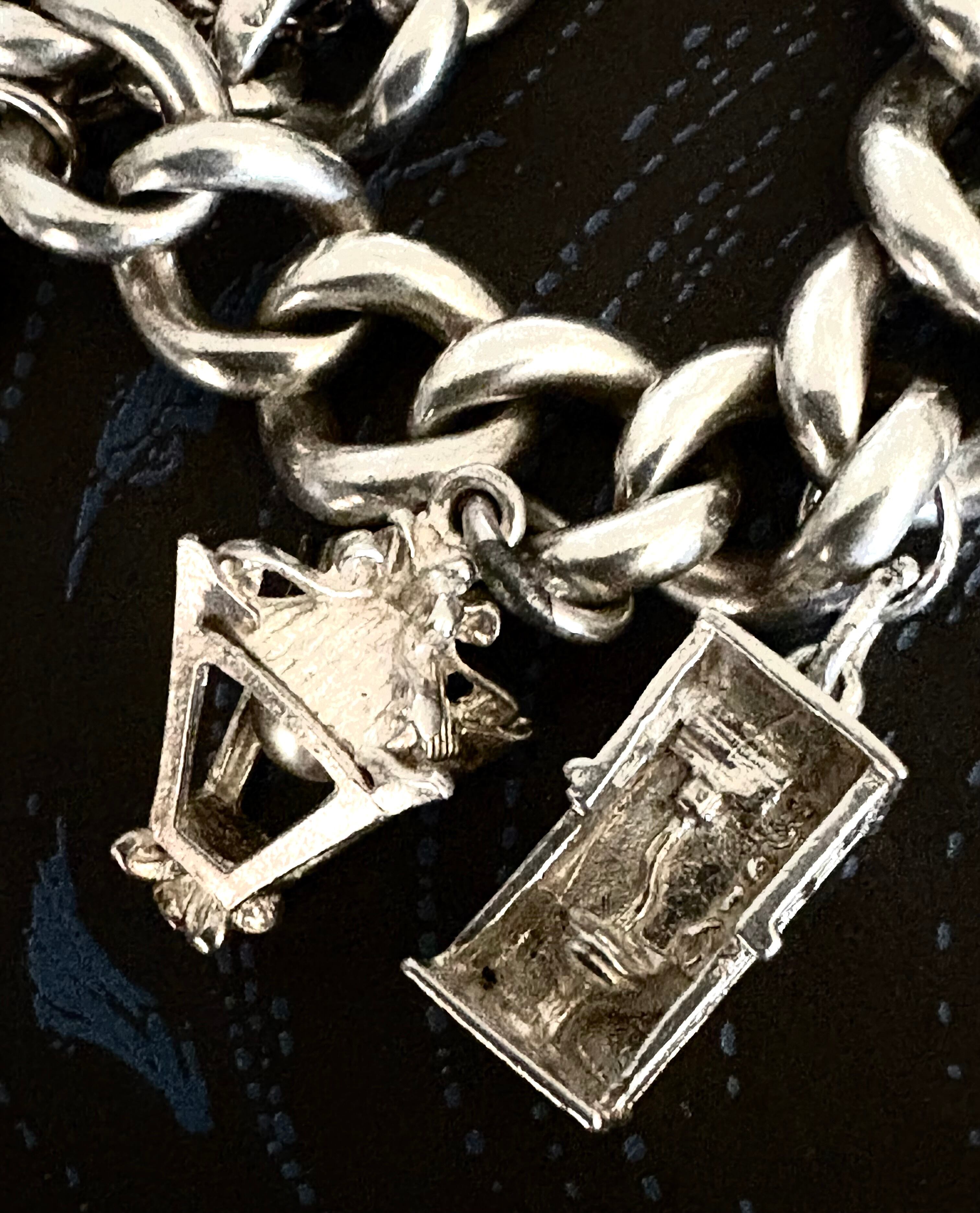 英国ビンテージ ローラースケート/BOXトイレ アンティークジャグ ラッキーチャームブレスレット 6個 極太ヘビー シルバー純銀67.8g/20cm セーフティーチェーン パドロック バーミンガム1971年MW社製 紳士 メンズ