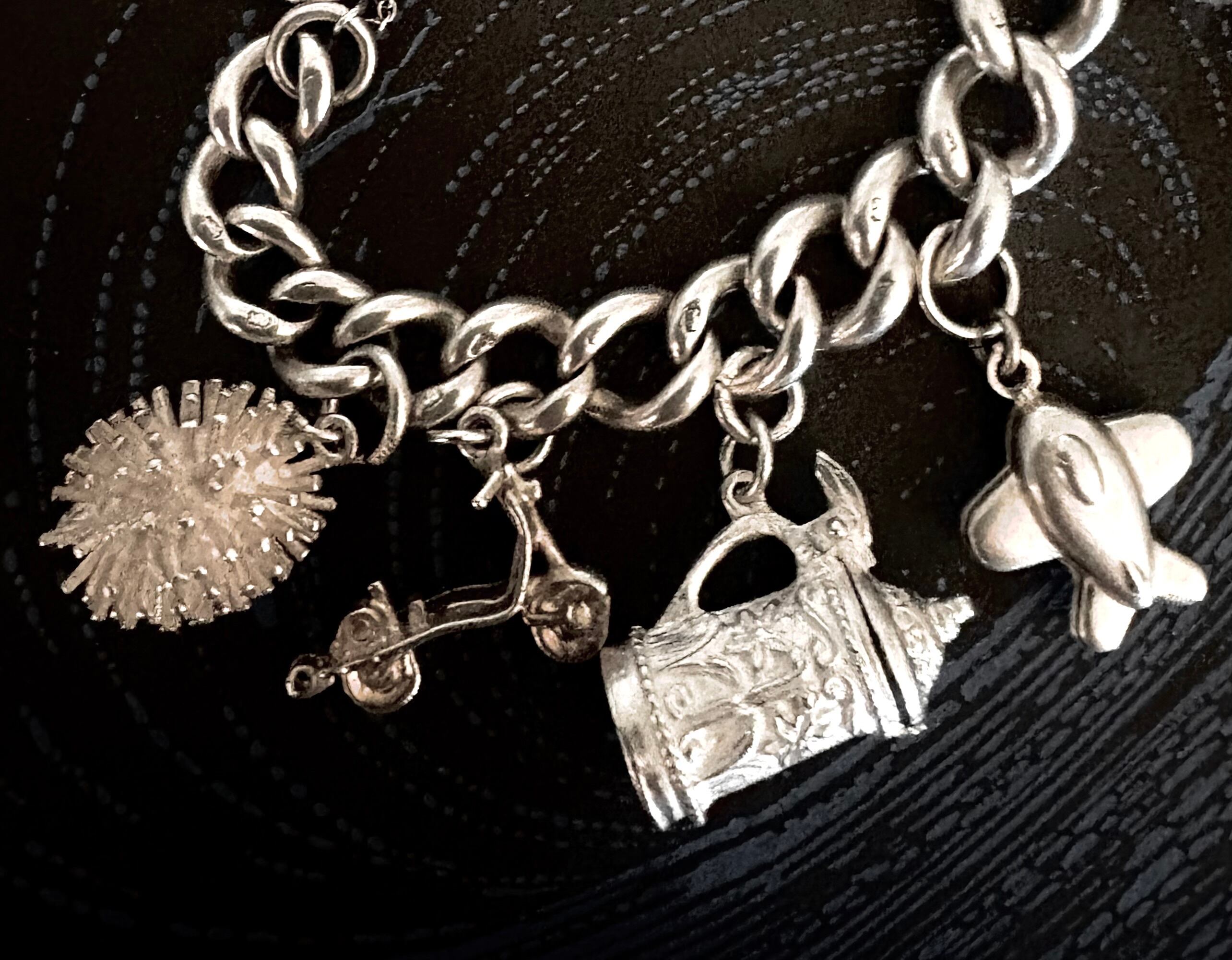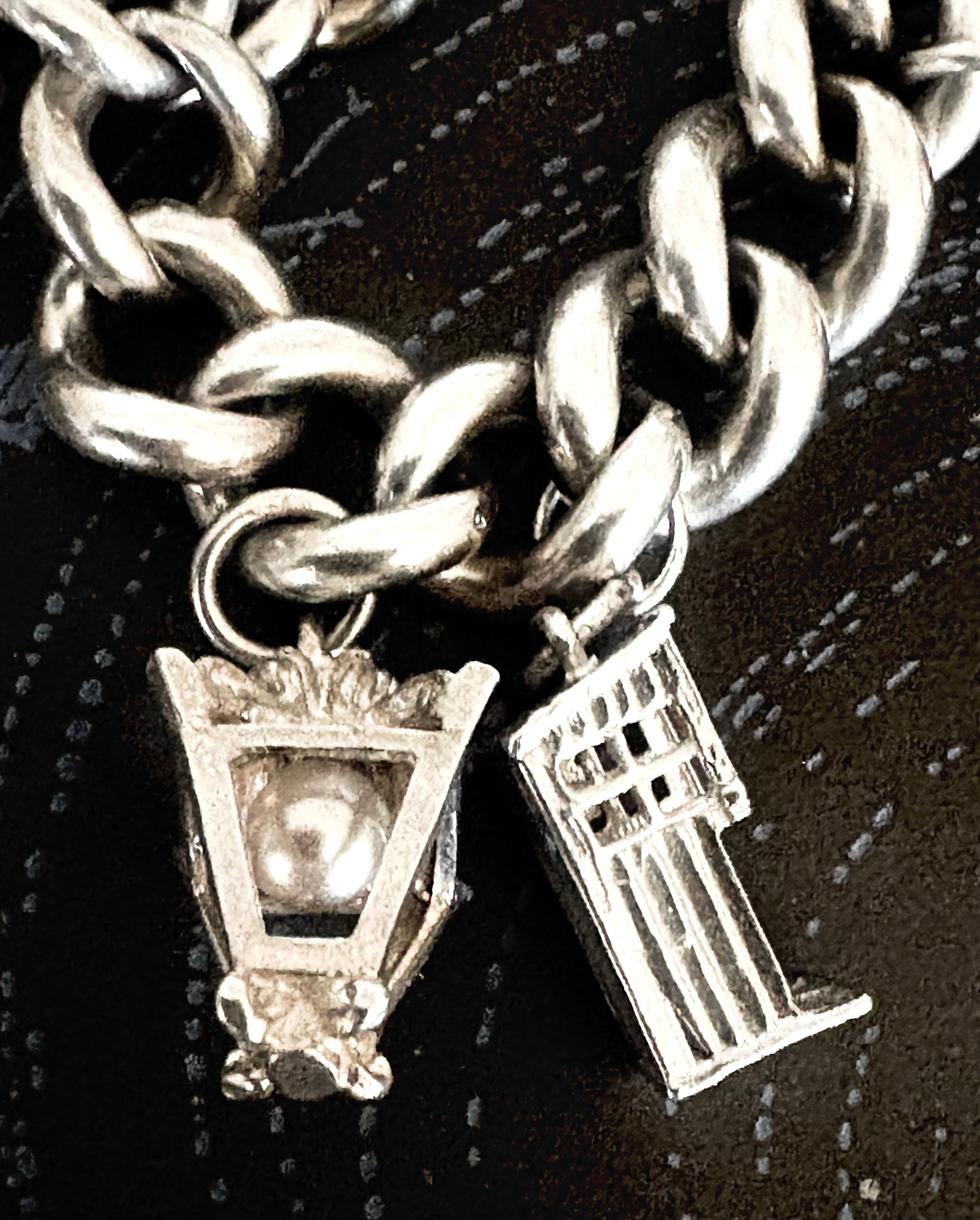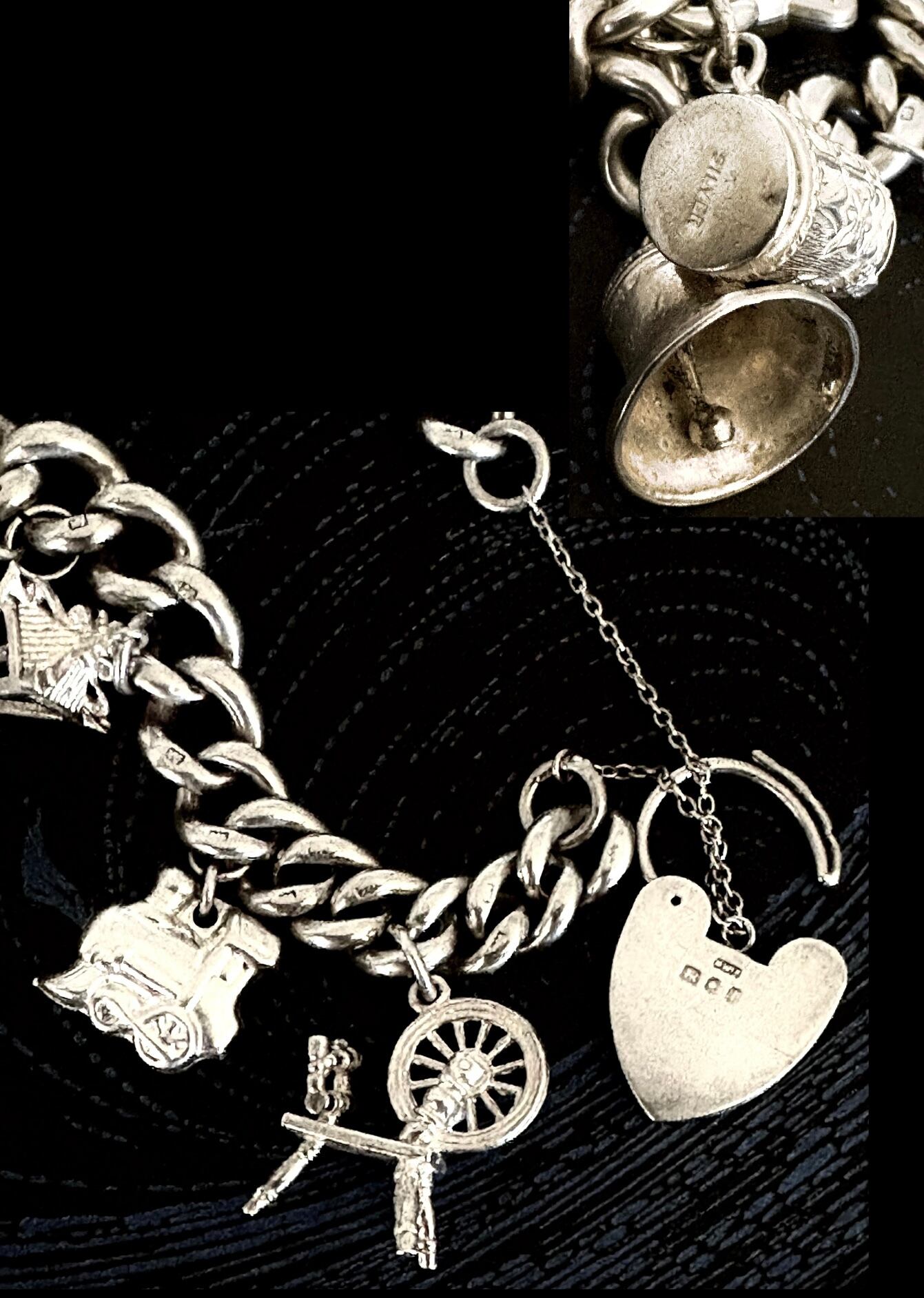 英国ビンテージ ローラースケート/BOXトイレ アンティークジャグ ラッキーチャームブレスレット 6個 極太ヘビー シルバー純銀67.8g/20cm セーフティーチェーン パドロック バーミンガム1971年MW社製 紳士 メンズ