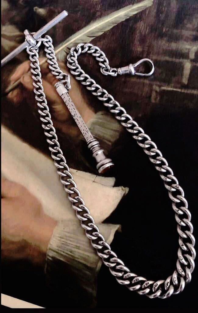 英国アンティーク ペンシル シールフォブ シトリン石付 シャトレーン アルバティーナ 懐中時計チェーン シルバー純銀 ビクトリア期 1890年代 ウオッチチェーン ビクトリアンファッション アンティークコレクション