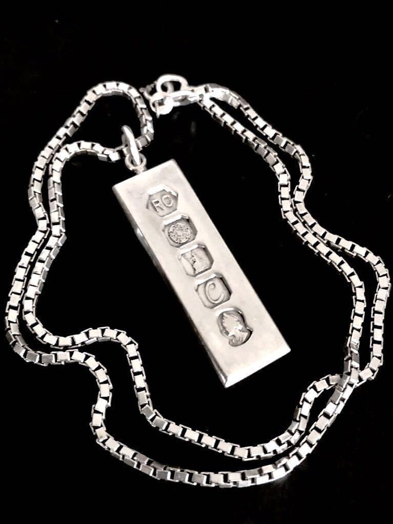 英国ビンテージ ブリタニア シルバー958 純銀28.7g インゴット ペンダント/フォブ 925チェーン47cm エリザベス女王1977年 シェフィールド JD社製 シルバーコレクション シルバーホールマーク Britishmade/Britanian Silver