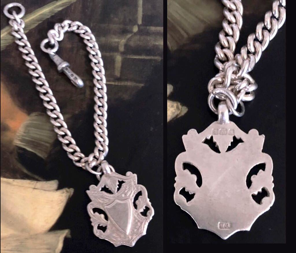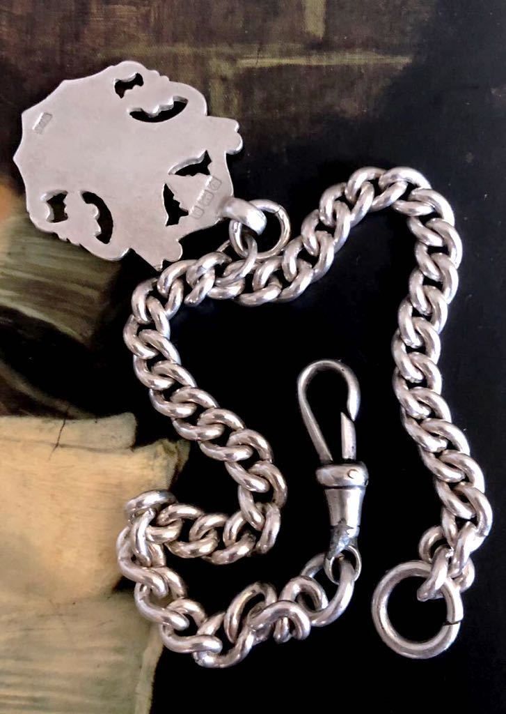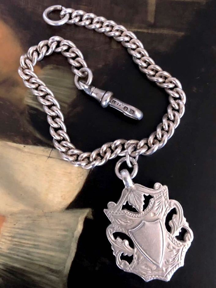 英国アンティーク シルバーブレスレット フォブ チェーン シェールド/盾 純銀19.6g バーミンガム エドワード期 1910年 WA社/全刻印 シルバーホールマーク メンズファッション 英国ファッション 英国スタイル アンティークコレクション Britishmade