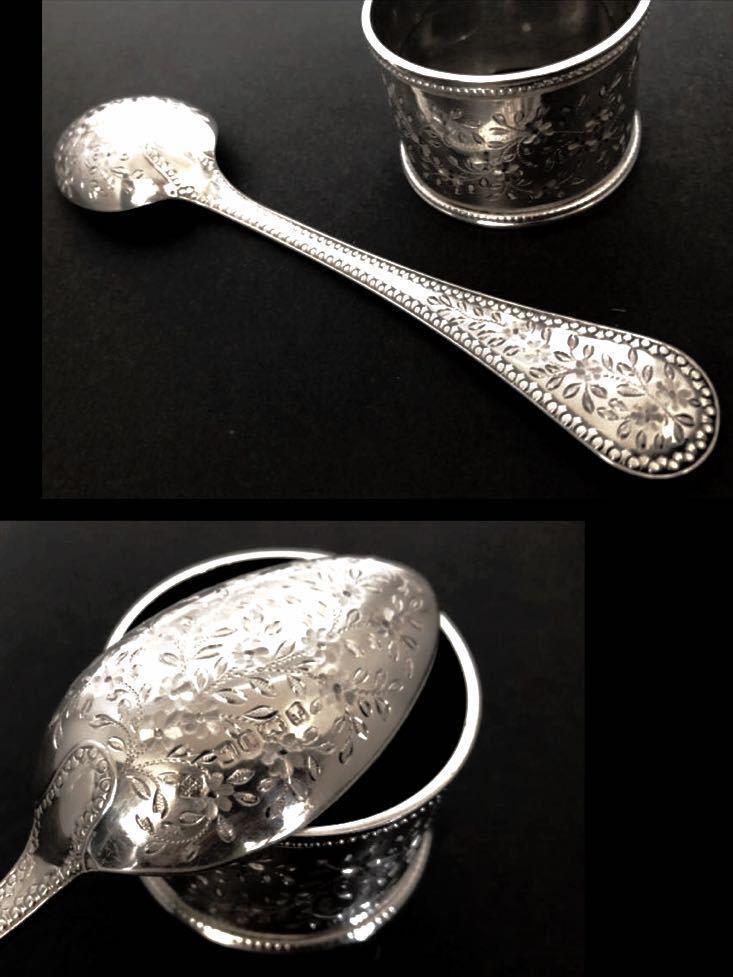 英国アンティーク スプーン&ナプキンリング/クリスニングセット 草花装飾 シルバー 純銀 カトラリー シェフィールド ビクトリア期1887年 箱付/全刻印 革製 レザーボックス アンティークディスプレイ コレクターズ