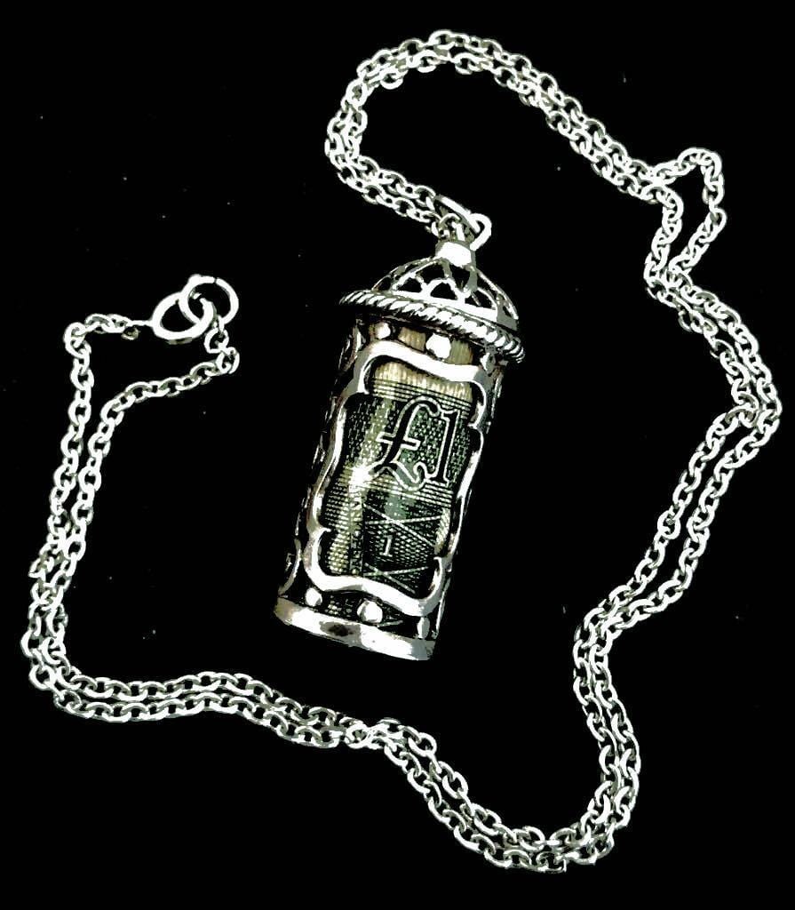 英国ビンテージ 1ポンド 紙幣 筒形フレーム シルバー925 チャーム /フォブ/ペンダント チェーン 純銀6g/45cm イギリス 英国スタイル ビンテージファッション コレクターズ Britishmade