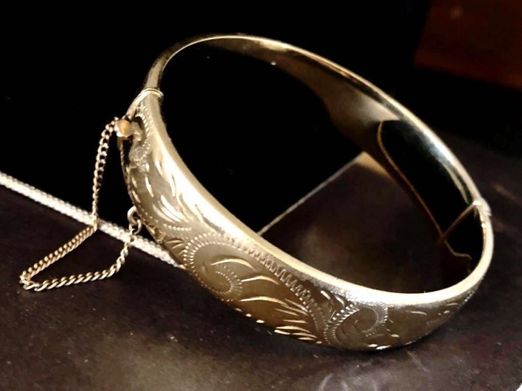 英国ビンテージ R.GOLD ゴールド バングル ブレスレット 唐草模様 セーフティーチェーン 19g 18cm 1940年代頃 刻印 EXCALIBUR/ギフトボックス ビンテージジュエリー ビンテージアクセサリー ロールドゴールド レディースファッション Britishmade