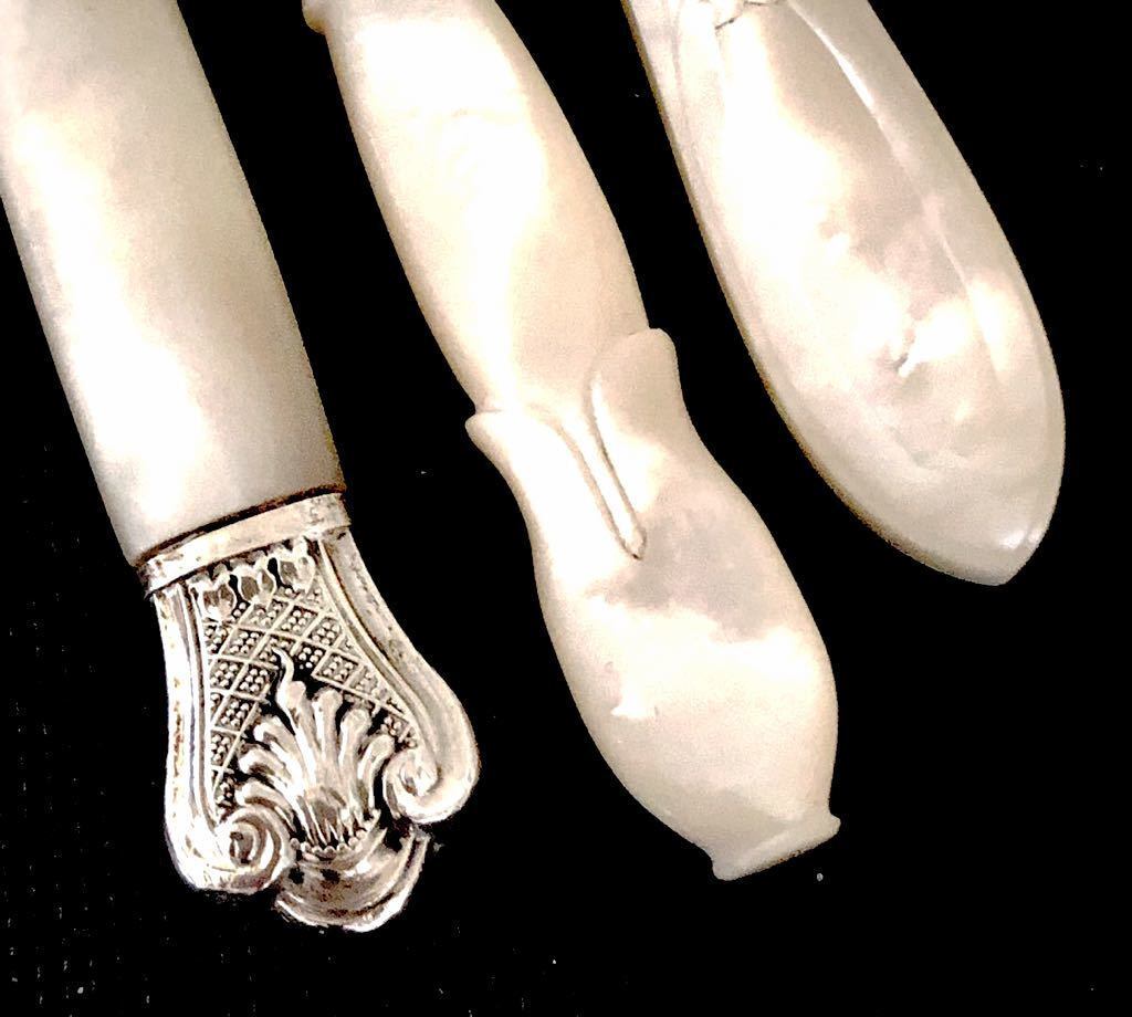 英国アンティーク フォーク バターナイフ 純銀 手彫 白蝶貝 マザーオブパール シルバー カトラリーセット3本 シェフィ―ルド ビクトリア期1851年HA社製/全刻印 シルバーホールマーク イギリス雑貨 アンティークコレクション アンティーク雑貨 テーブルウエア コレクターズ Br