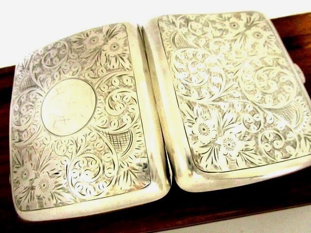 英国アンティーク シルバー シガレットケース 純銀 71.6g 両面彫金 唐草模様 バーミンガム ジョージ6世 1942年 RN社 店舗什器 アンティーク什器 アンテークディスプレイ アンティークのある生活 アンティークコレクション 喫煙具