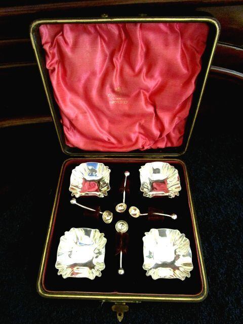 英国アンティーク シルバーp ソルト ディッシュ&スプーン 4ps 調味料入れセット箱付 ビクトリア期 シェフィールド/ゴールドスミス HB社製