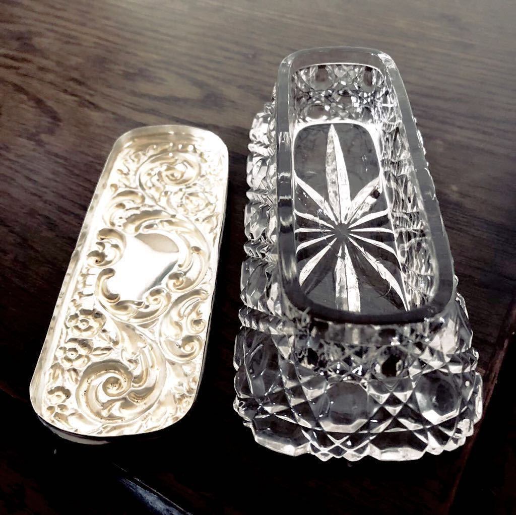 英国アンティーク シルバー トリンケット 長方形 ホブネイルカット ガラスケース ボックス テーブルジャー 純銀 ジョージ5世1909年 BPDC社製/全刻印 シルバーホールマーク アンテークガラス ガラス箱 アンテークディスプレイ アンティークコレクション テーブルコーディネー