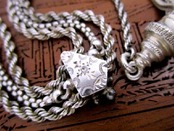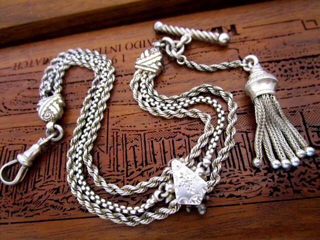 英国アンティーク シルバー チェーン 花柄彫金フォブ &タッセル 豪華3連 チェーン 懐中時計 純銀 ビクトリア後期