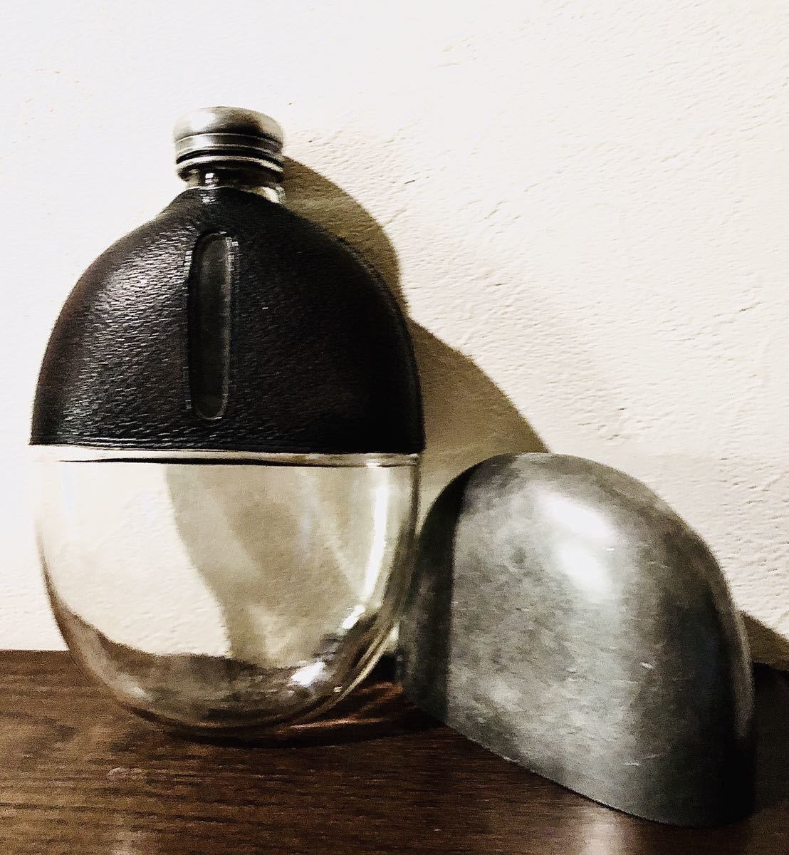 英国アンティーク スキットル ウイスキー ヒップフラスク ガラス&レザー シルバー 革製 オールドボトル 300ml 大型