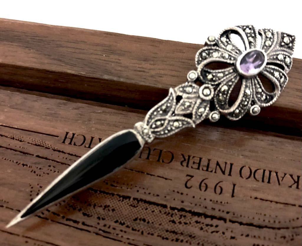 英国アンティーク/ビンテージ スターリングシルバー925 オニキス&アメジストブローチ ハットピン マーカサイト ART DECO アンティークファッション ビンテージファッション レディースファッション バースストーン 8月誕生石