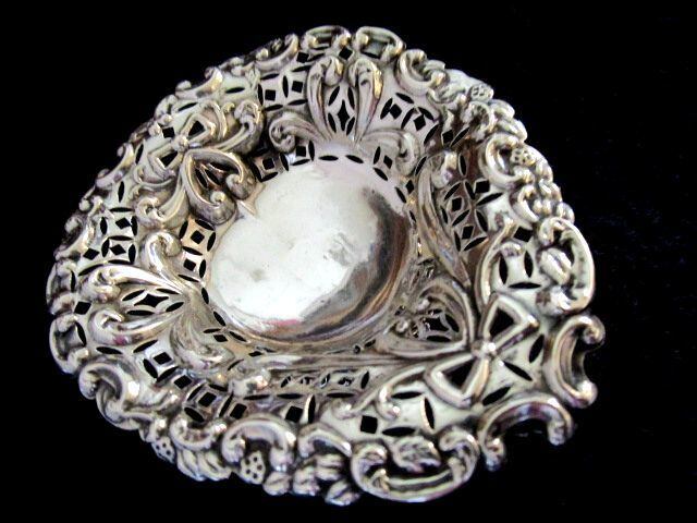 英国アンティーク シルバートリンケット/ボンボン ディッシュ 小皿 透かし リボン装飾 ハート型 純銀 ロンドン ビクトリア期1893年C.C社製