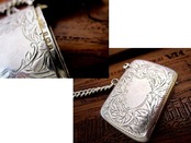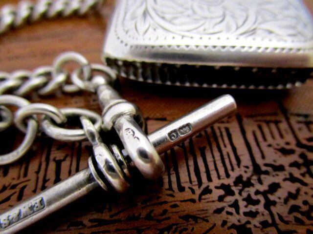 英国アンティーク ロングチェーン&ヴェスタ/唐草模様 マッチ箱56g 純銀 懐中時計 エドワード期 バーミンガム1908年JC社製