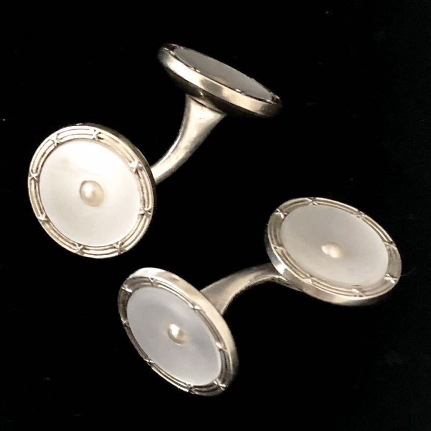 英国アンティーク 白蝶貝 シルバー カフス ボタン カフリンクス メンズ 紳士 純銀 ジョージ5世 バーミンガム1911年 CV&Co製/全刻印 マザーオブパール シルバーホールマーク 英国スタイル アンティークファッション コレクターズ 英国紳士 紳士御用達 メンズアクセサリー