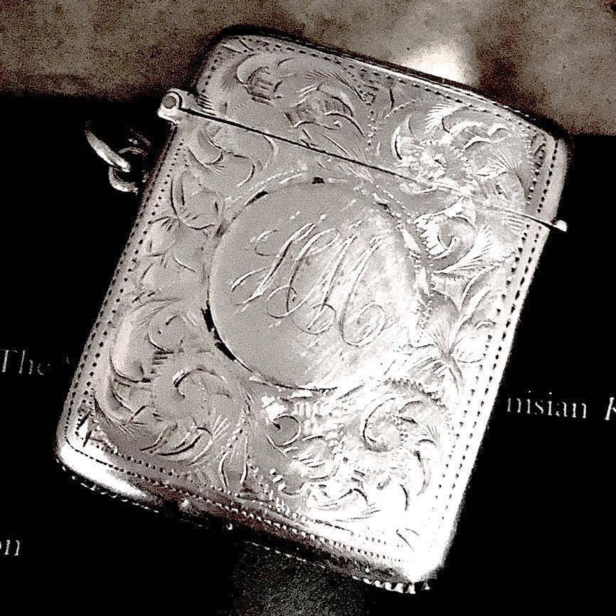 英国アンティーク シルバー ヴェスタケース マッチ箱 純銀 31g 両面彫金 唐草模様 ビクトリア期バーミンガム1900年SML社製/全刻印