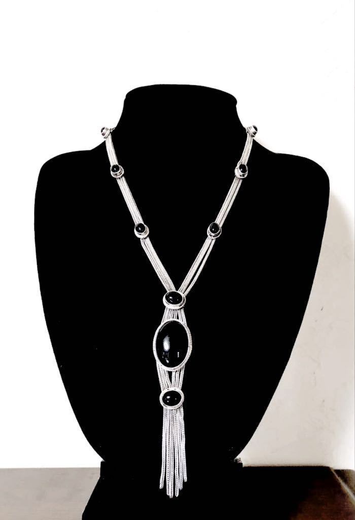 英国ビンテージ スターリングシルバー925 3連ネックレス チェーン タッセル ブラック オニキス 石付 ペンダント 純銀47g ビンテージファッション ビンテージジュエリー レディースファッション ART-DECO