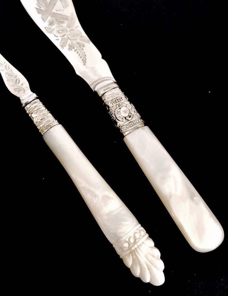 英国アンティーク バターナイフ&ピクルスフォーク 手彫 マザーオブパール 白蝶貝 シルバーp カトラリー2本セット 英国雑貨 イギリス雑貨 英国スタイル テーブルコーディネート シルバーウエア テーブルウエア アンティークコレクション アフタヌーンティー 紅茶 アンティーク