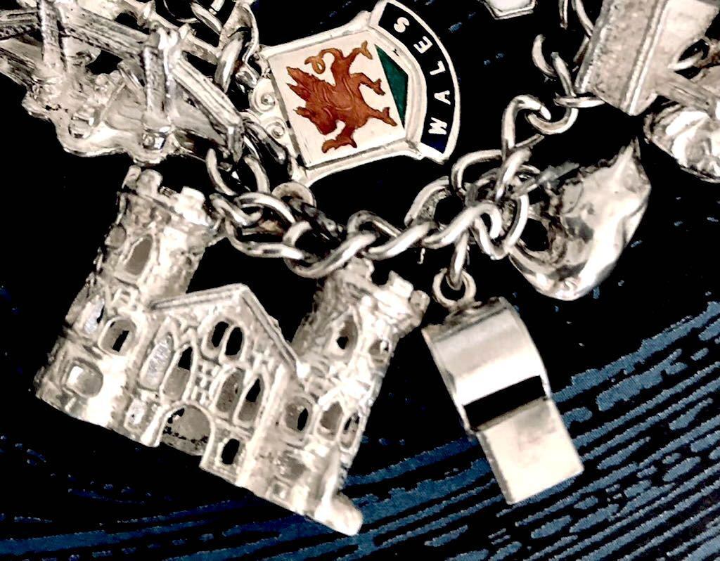 英国ビンテージ スターリングシルバー ブレスレット チェーン チャーム 25個 純銀58g バイブル/城/汽車/ベル/バグパイプ イギリスタウン アンティークジュエリー ビンテージジュエリー ビンテージアクセサリー ビクトリアンファッション シルバーホールマーク Britishmade