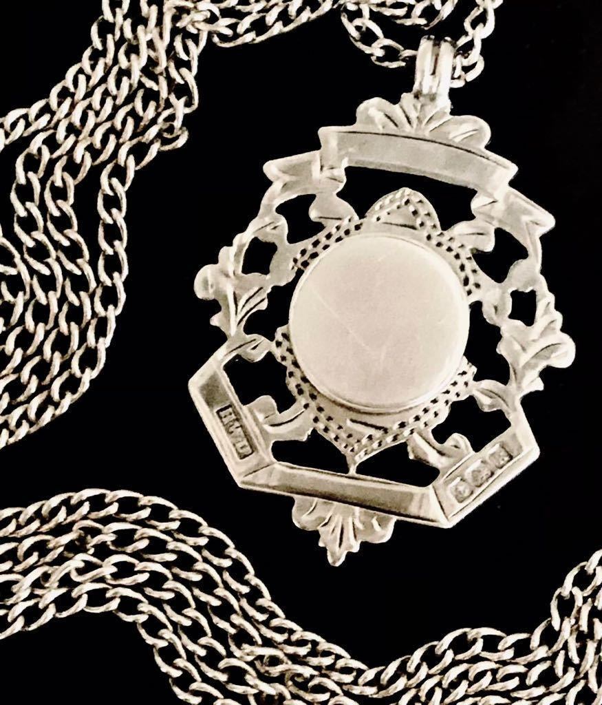 英国アンティーク シルバー 両面装飾 シェールド型 フォブ/ペンダント チェーン 75cm 17.6g 純銀 エドワード期 バーミンガム1909年 WH社製