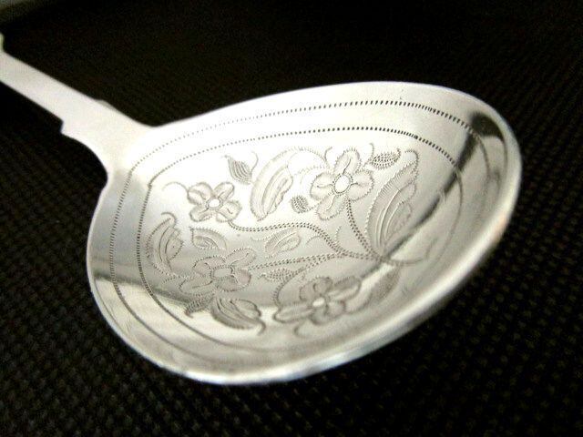 英国アンティーク スターリングシルバー キャディースプーン 花模様 フィドルパターン 純銀 ロンドン ビクトリア期1844年カトラリー