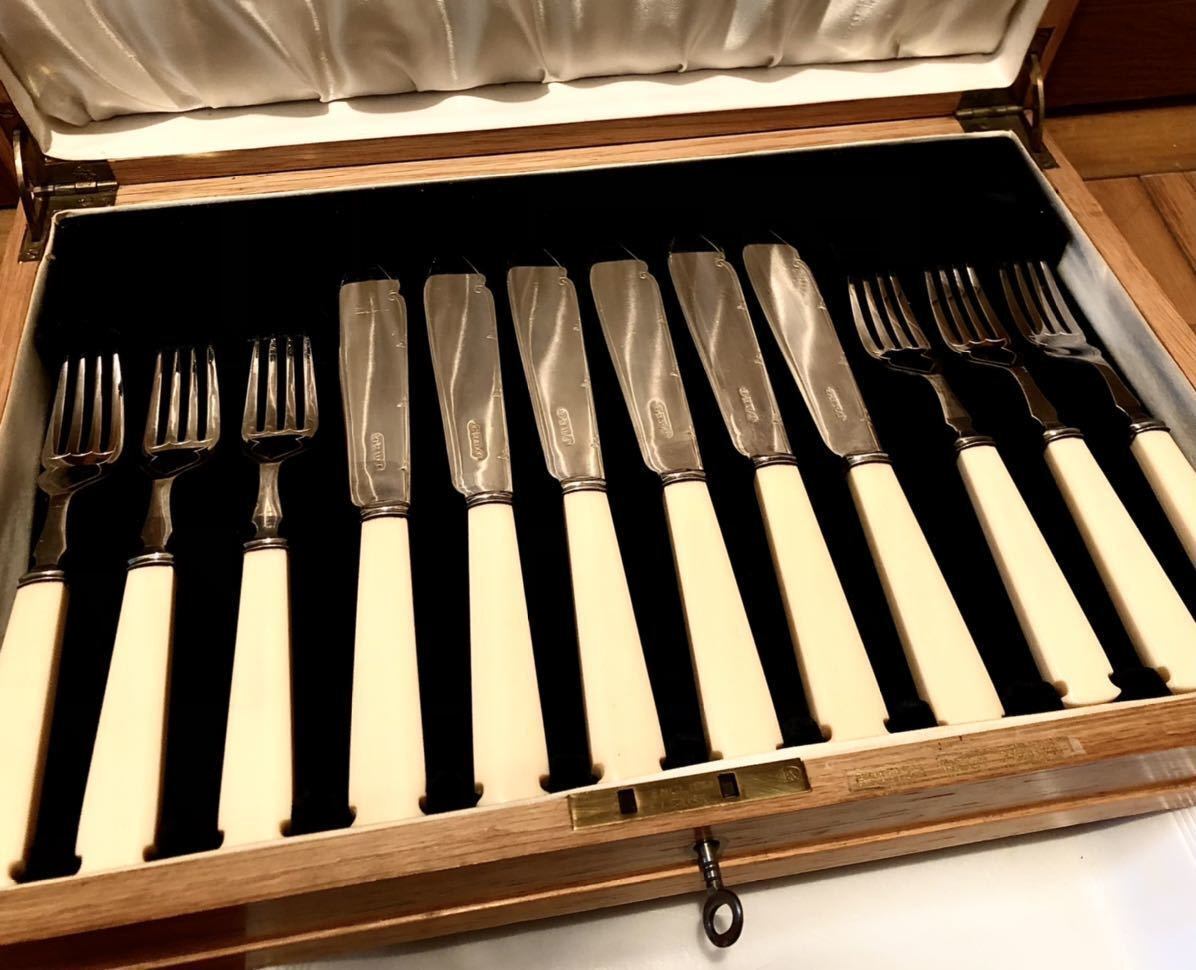 英国アンティーク シルバーp アイボリー フォーク&ナイフ カトラリーディーナーセット ケース 木箱/鍵付12本6人用 1950s Priestley&Moore社 コレクターズ テーブルコーディネート シルバーウエア テーブルウエア アンティーク雑貨 ビンテージ雑貨 英国雑貨 アンティークのあ