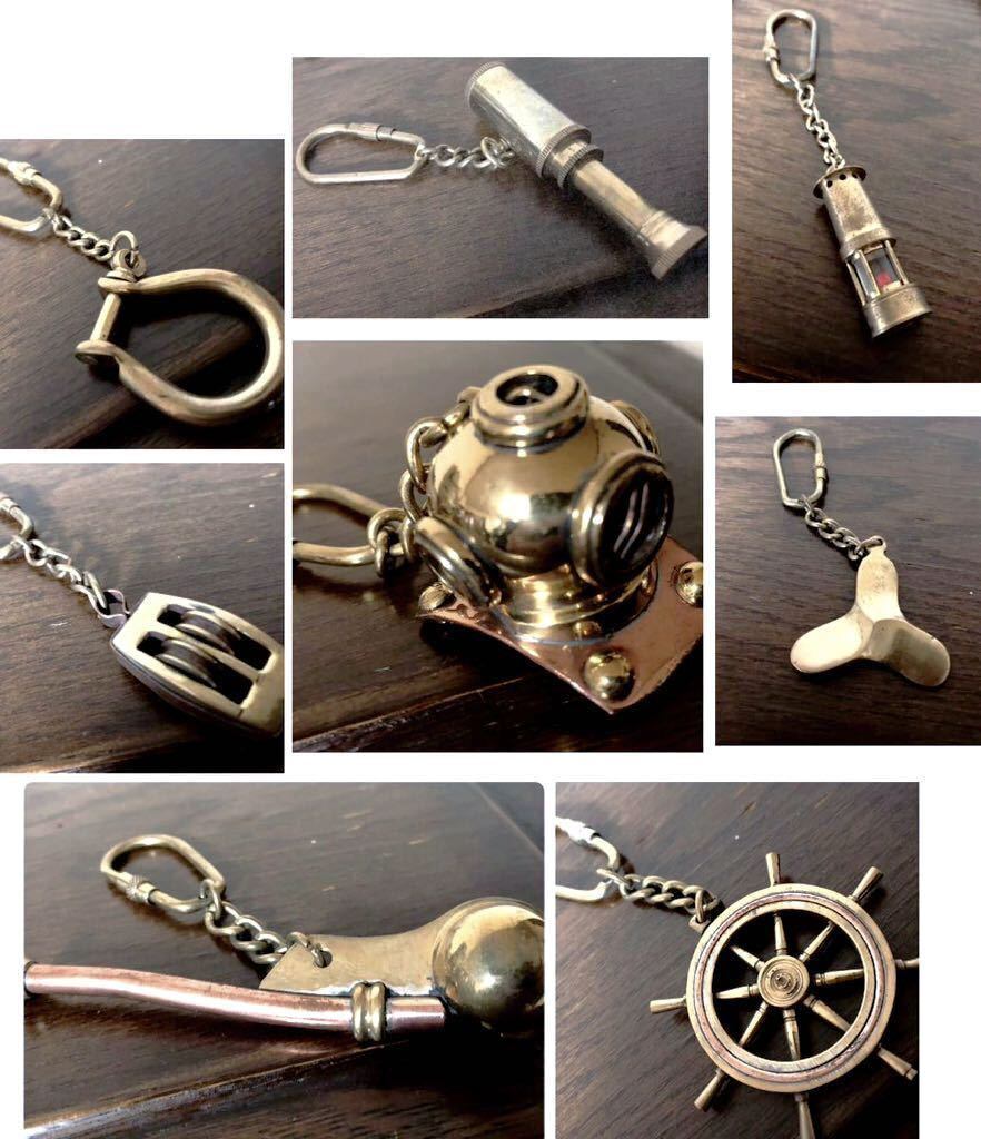 英国ビンテージ キーホルダー フォブ 船舶/航海 潜水ヘルメット/ホイール/ランタン/望遠鏡/笛 ブラス 真鍮
