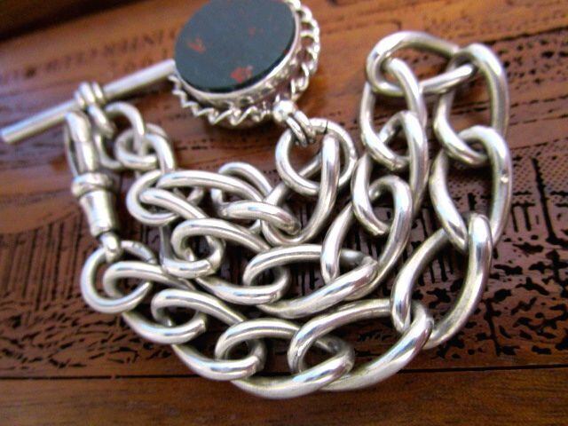 英国アンティーク 極太リンクチェーン 方位磁石/コンパス アゲート石 フォブ 純銀 チェスター ビクトリア期 懐中時計