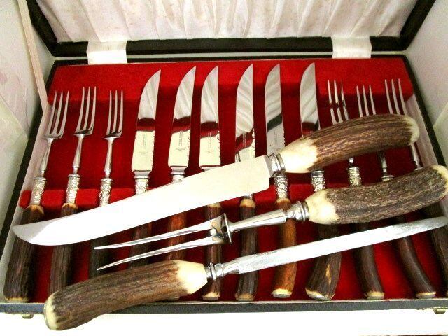 英国ビンテージ シルバーp&ホーン/角 ステーキナイフ&フォーク 6人用シャープナー計15本 ホーンカトラリー セット シェフィールド元箱×2