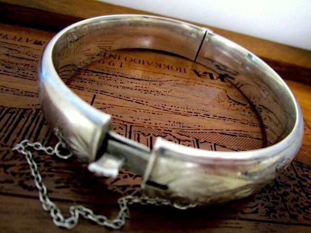 英国ビンテージ シルバー バングル ブレスレット チェーン 草花模様 19g 純銀 バーミンガム1960年CPS社製