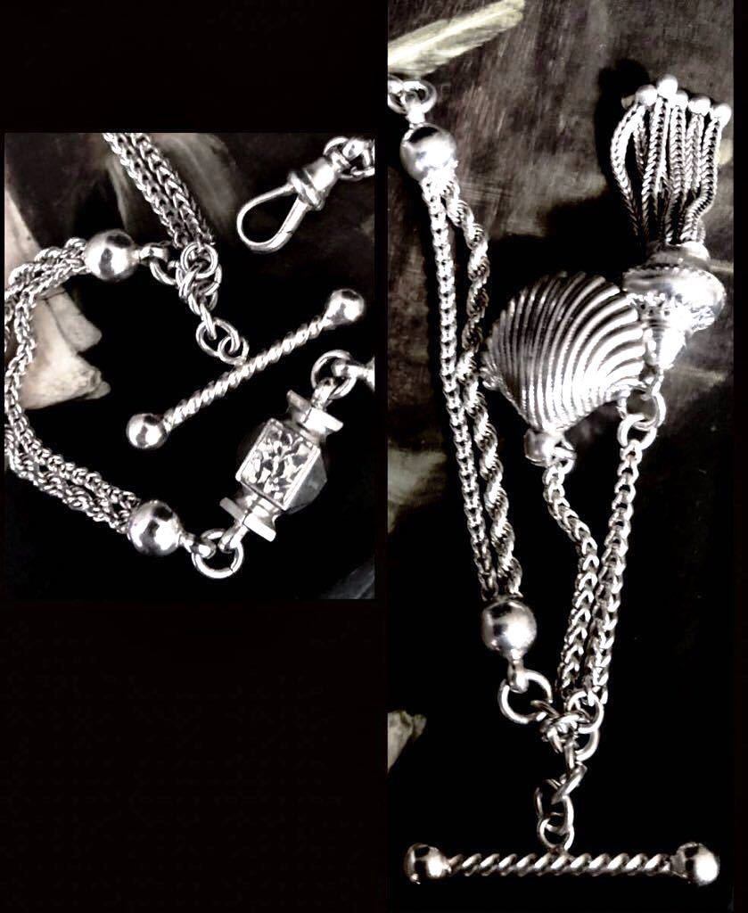 英国アンティーク アルバティーナ 二連チェーン 彫金細工 タッセル&シェル型 フォブ 懐中時計 純銀20g ビクトリア後期1890年頃 シルバー ガードチェーン ウオッチチェーン アルバートチェーン コレクターズ Britishmade アンティークコレクション
