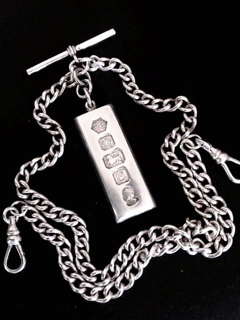 英国ビンテージ エリザベス女王 ダブル アルバートチェーン インゴット フォブ ネックレス 純銀63.5g シルバー 懐中時計 1977年ペンダントネックレス