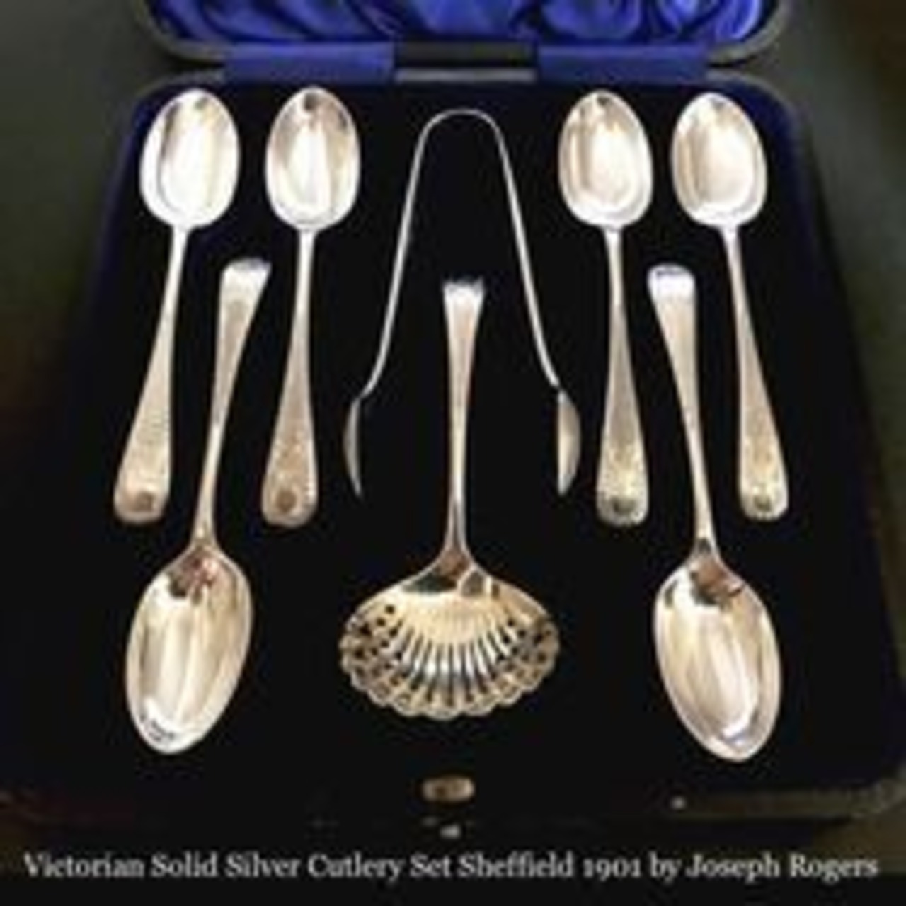 英国アンティーク スプーン/トング/シュガーシフター カトラリーセット8本 ブライトカット 茶道具 アフタヌーンティー シルバー純銀 ビクトリア期1901年JR社製/箱付 コレクターズ テーブルウェア